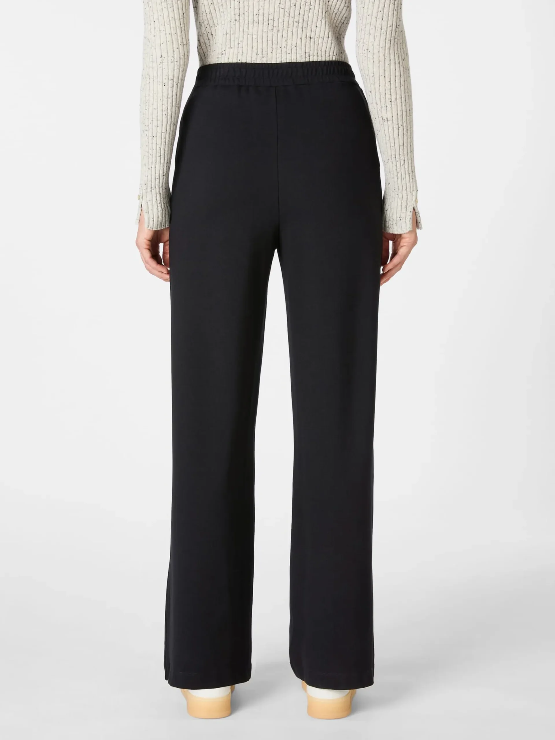 Komfort steht bei dieser Hose klar im Vordergrund, das betrifft den Schnitt wie auch die verwendeten Materialien. Der Jersey besteht zum Gutteil aus LENZING™ ECOVERO™-Viskose – einer Regeneratfaser, die aus Holz und Zellstoff aus zertifizierten und kontrollierten Quellen gewonnen wird und sich durch eine hohe Festigkeit und eine sehr glatte, seidig-weiche Oberfläche auszeichnet. Hinzu kommt ein Anteil an recyceltem Polyamid und Elastan für mehr Elastizität und Formtreue. Geschnitten ist die verschlusslose Hose mit weitem, geradem Bein und breitem Gummibund, der vorn glatt und hinten gerafft ist. Zwei Seitentaschen bieten Platz für Kleinteile des täglichen Bedarfs. Die Jerseyhose lässt sich gut mit sportlichen und lässigen Freizeitoutfits kombinieren, macht aber auch im Homeoffice eine gute Figur.