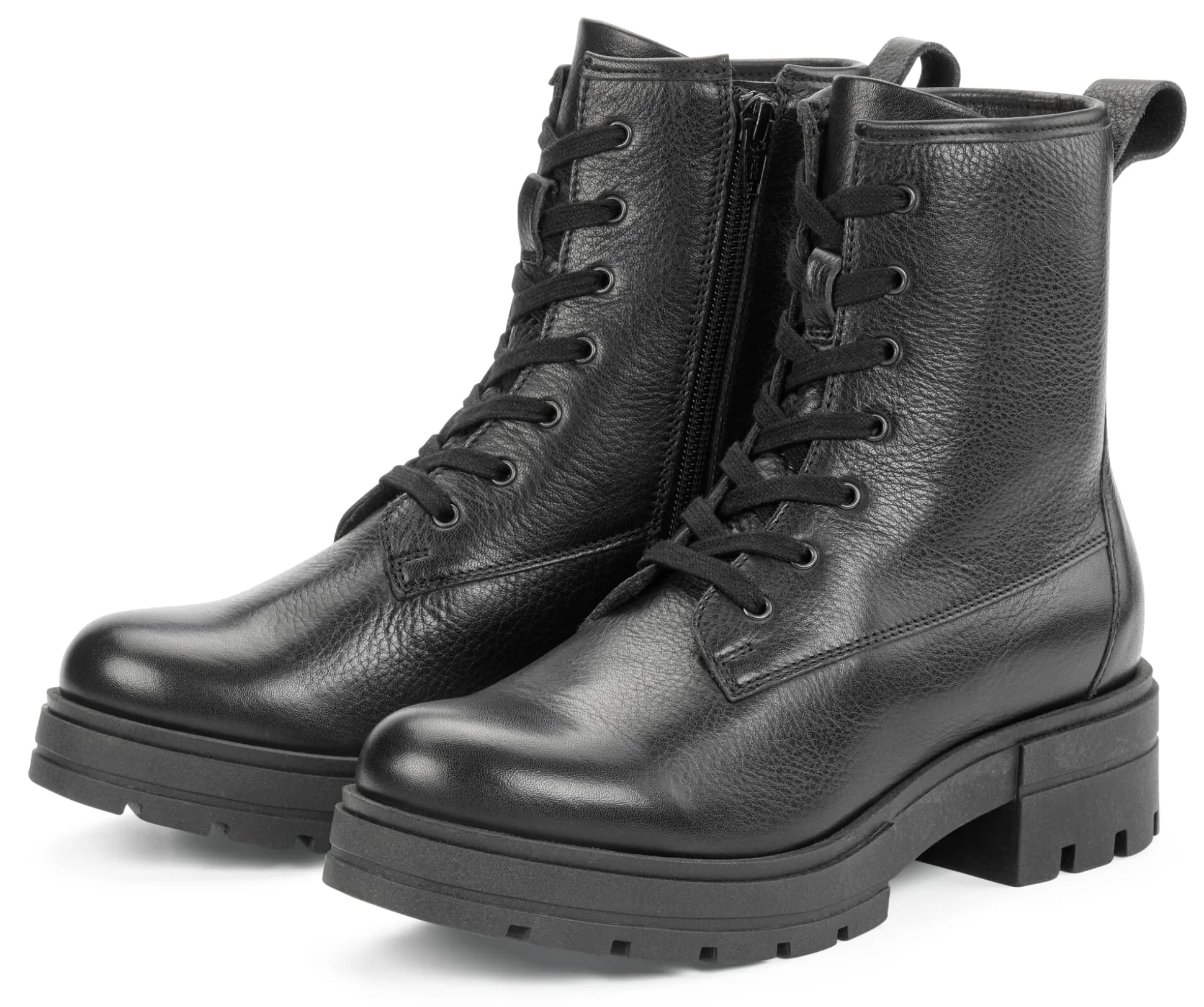 Dieser überknöchelhohe Schnürstiefel kombiniert ein markant genarbtes, vegetabil gegerbtes Rindleder mit einem wärmenden Lodenfutter aus reiner Wolle. Die starke, leicht profilierte Gummisohle sorgt zusätzlich dafür, Kälte von unten abzuhalten. Der Schuh wird geschnürt, ein seitlich eingesetzter Reißverschluss erlaubt jedoch ein schnelles und komfortables An- und Ausziehen.