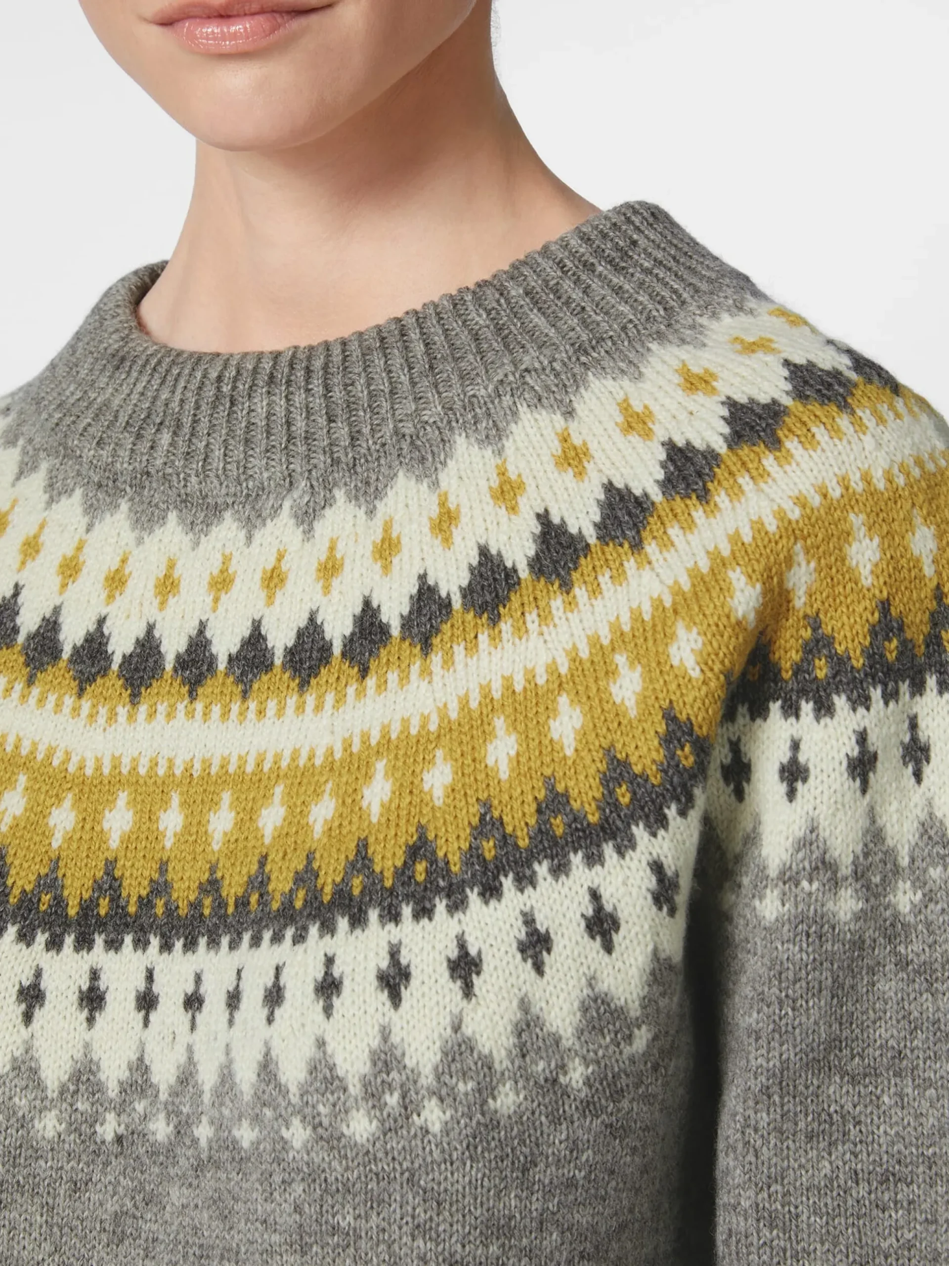 Nicht allein das klassische norwegische Varde-Muster, das über die rundgestrickte Schulterpasse läuft, macht die Besonderheit dieses Pullovers aus, sondern auch das Material. Rauma strickt ihn aus reiner norwegischer Wolle, die dank ihrer Strapazierbarkeit, Unempfindlichkeit und Elastizität eine gute Balance zwischen Funktionalität und Komfort bietet. Zugleich verleiht ihm die Norwegerwolle wunderbar wärmende und temperaturregulierende Eigenschaften, denn die Wollfasern sind stark gekräuselt und können so viel Luft einschließen, was eine effektive Isolierung bewirkt. Rippenstrickbündchen bilden den Abschluss an Hals, Ärmeln und Rumpf.