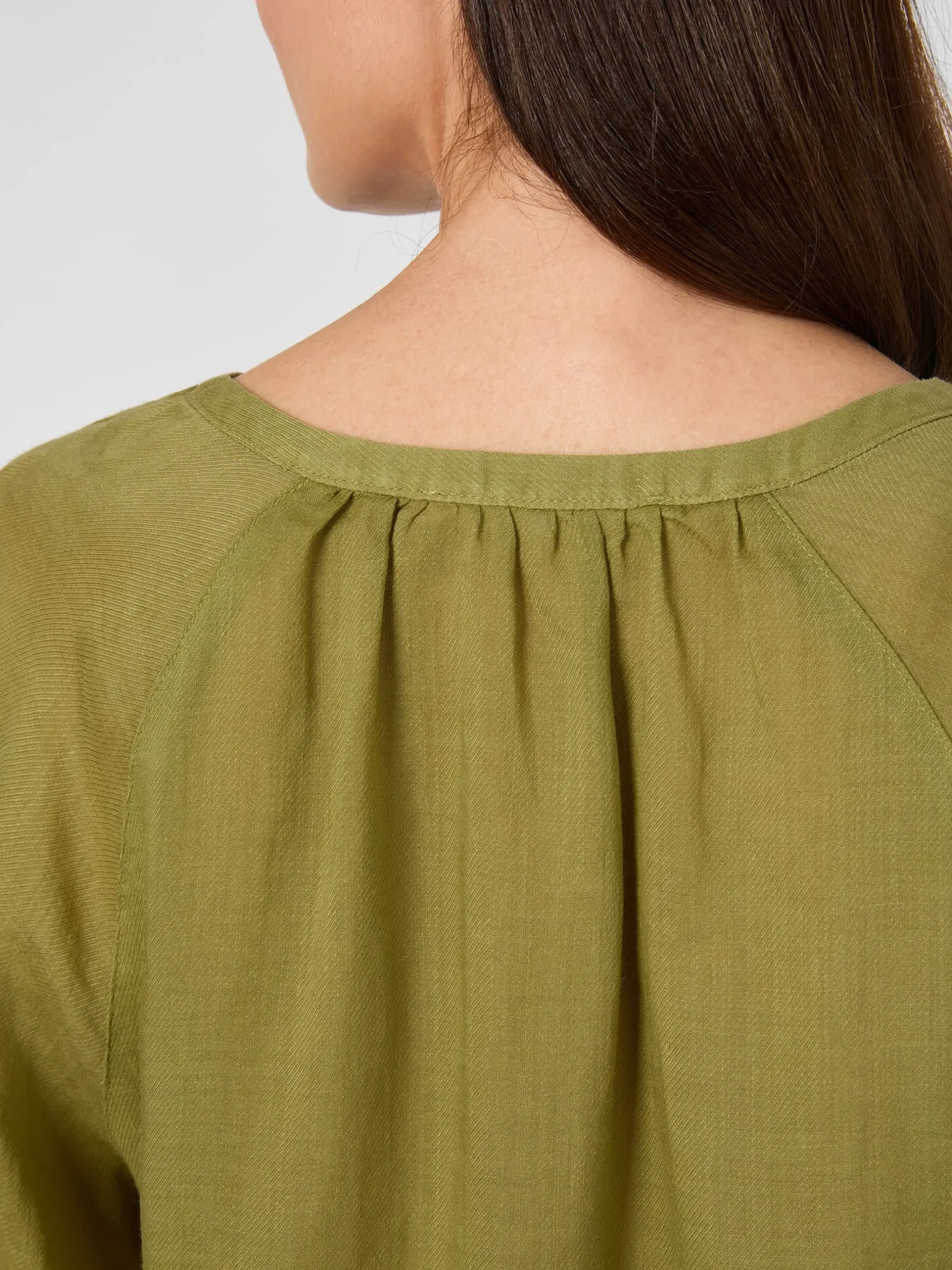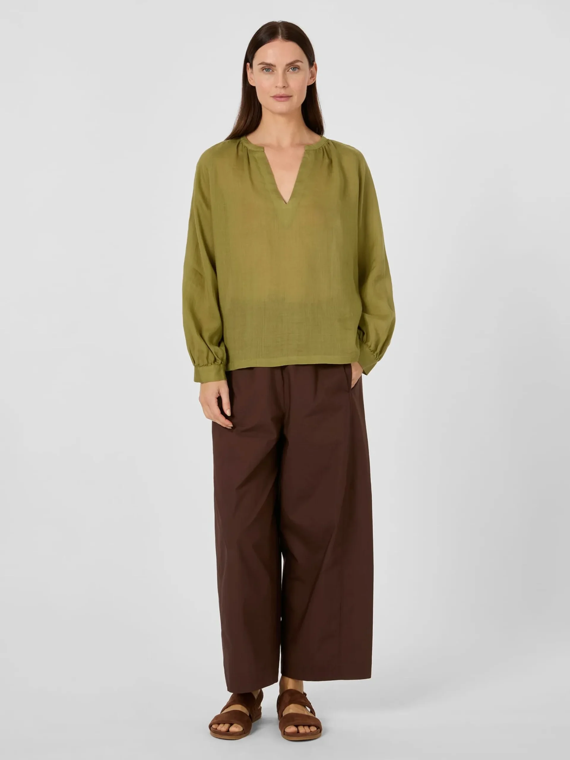 Ramie ist eine schnell wachsende Pflanze aus der Familie der Brennnesselgewächse, die beim Anbau nur wenig Wasser verbraucht. Die langen, reißfesten Fasern lassen sich zu feinen Garnen verspinnen und werden daher schon seit Jahrtausenden zu hochwertigen Textilien verarbeitet. Gewebe daraus sind überaus strapazierbar, dabei luftig-leicht und angenehm griffig. Ähnlich wie Leinen können sie viel Feuchtigkeit aufnehmen schnell wieder nach außen ableiten, was sie besonders atmungsaktiv macht – ideal für eine sommerliche Schlupfbluse wie diese. Lanius fertigt sie aus reiner, seidig glänzender Ramie. Sie ist in lockerer Passform gearbeitet, mit V-Ausschnitt und Raglanärmeln. Der Saum ist vorn gerade und hinten leicht gerundet. Für einen schönen femininen Look sorgen die gerafften Partien vorn und hinten am Ausschnitt und an den Ärmeln.