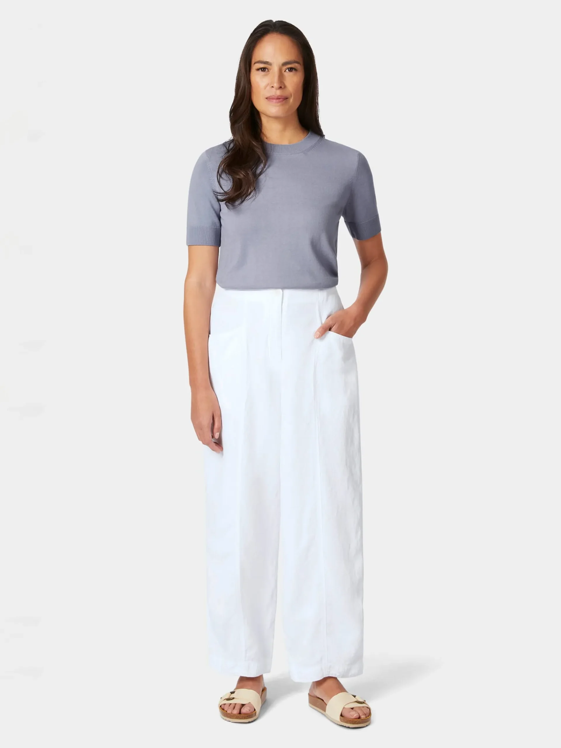 Diese lässige Hose in leichter O-Form fertigt Oska aus Lyocell und Leinen – einer Materialkombination, die für die warme Jahreszeit geradezu ideal ist. Denn beide Fasern können viel Feuchtigkeit aufnehmen und rasch wieder an die Umgebung abgeben, was einen angenehm kühlenden Effekt bewirkt. Die Hose ist mit zwei Eingrifftaschen ausgestattet und wird mit Reißverschluss und Steinnussknopf geschlossen. Ein Teilgummibund im Rücken sorgt für noch mehr Tragekomfort. Langsteilungsnähte vorn und hinten verschlanken die Silhouette optisch.