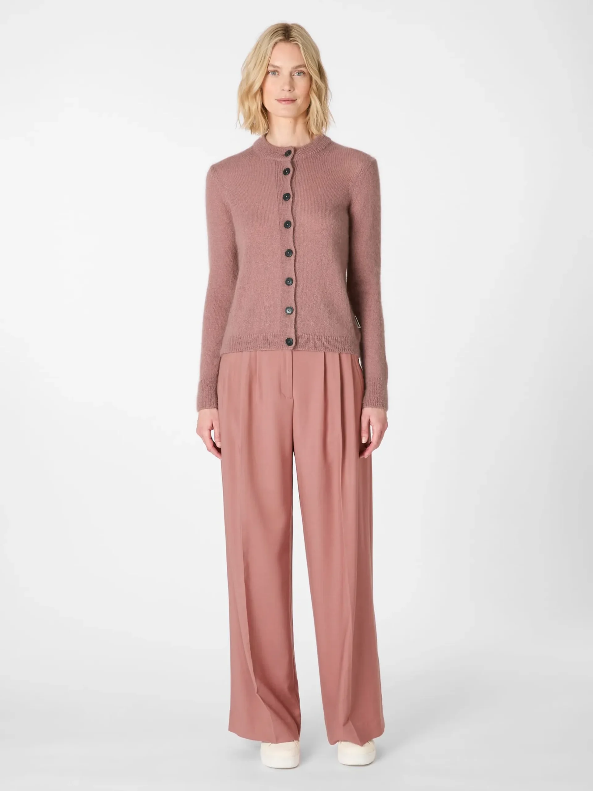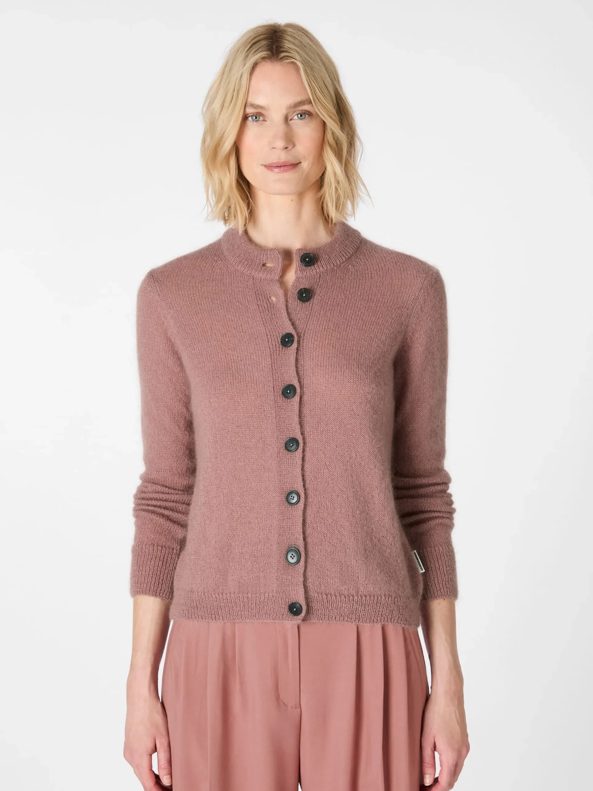Die Materialkombination, die in dieser schönen Strickjacke verwendet wird, ist selten zu finden: Wolle und Mohair, beide Materialien stammen aus kontrolliert biologischer Tierhaltung. Sie werden hier zu einem leichten und unnachahmlich weichen Gestrick verarbeitet, das nicht nur besonders gut wärmt, sondern auch temperaturausgleichend und atmungsaktiv ist. Kurzum: In dieser Strickjacke werden Sie sich rundum wohlfühlen, selbst wenn die Temperaturen einmal unverhofft ansteigen sollten. Gearbeitet ist die Strickjacke mit Rippenstrickbündchen an Hals, Ärmeln und Rumpf. Markante Papierknöpfe und ein Strickdetail im Nacken runden das Design ab.