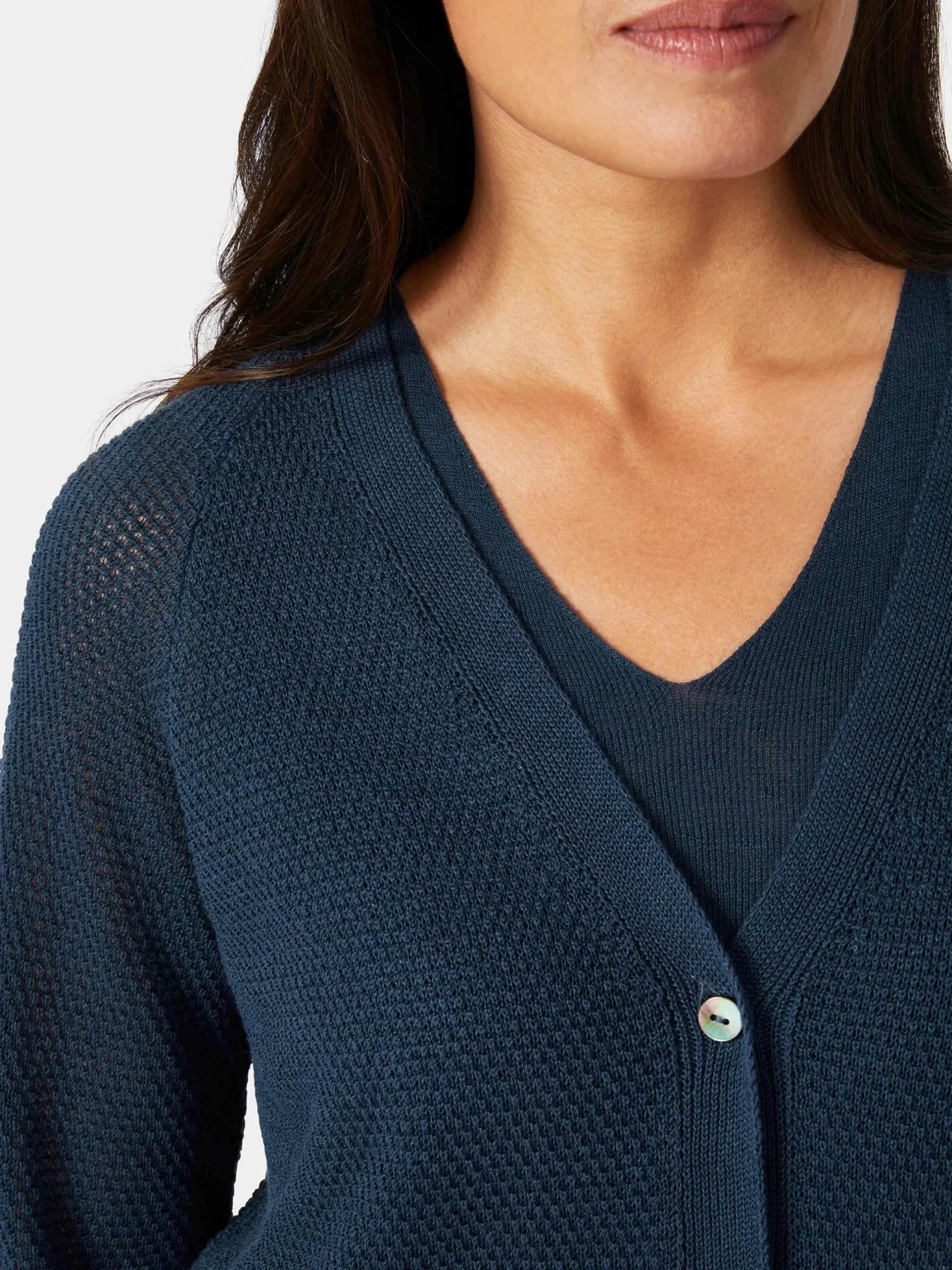 Dank des luftigen Strickbilds ist diese hüftlange Strickjacke eine gute Begleiterin an warmen Frühlingstagen und frischen Sommerabenden, wozu auch die Wahl der Materialien beiträgt. Les Racines du Ciel verwendet hier eine Kombination, die zu 70 Prozent aus atmungsaktivem, kühlendem Leinen und zu 30 Prozent aus hautsympathischer, kontrolliert biologisch angebauter Baumwolle besteht. Das plastische Gestrick liegt leicht auf der Haut und zeigt eine feine Transparenz. Gearbeitet ist die Strickjacke in bequemem, legerem Schnitt mit Raglanärmeln und Rippenstrickbündchen an Ärmeln und Rumpf. Ausschnitt und Knopfleiste sind ebenfalls in Rippenstricktechnik gefertigt.