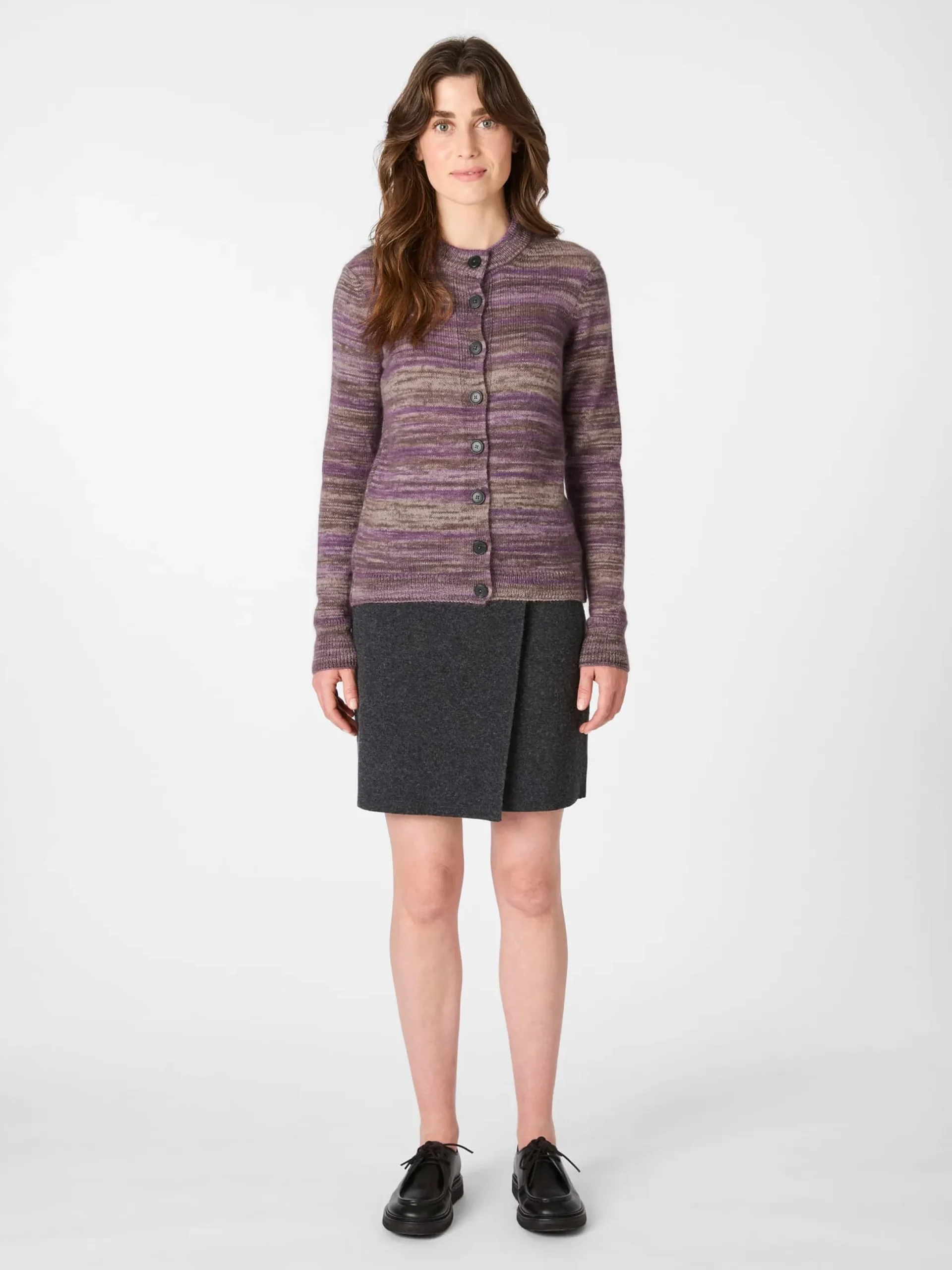 Zwei wunderbar wärmende Materialien werden bei dieser Strickjacke zu einem flauschig-weichen Gestrick verarbeitet: Wolle und Mohair, beide aus kontrolliert biologischer Tierhaltung. Die Fasern bieten nicht nur eine hervorragende Wärmeisolation, sie besitzen auch temperaturausgleichende Eigenschaften. So können Sie sich in dieser Strickjacke rundum wohlfühlen, selbst wenn die Temperaturen an einem kühlen Herbst- oder Frühlingstag unverhofft ansteigen. Zudem zeigt Mohair, das feine Haar der Angoraziege, einen subtilen Glanz, der in Verbindung mit den verschiedenfarbigen Garnen einen schönen Akzent setzt. Rippenstrickbündchen an Hals Ärmeln und Rumpf, zart schimmernde Papierknöpfe und ein Strickdetail im Nacken runden das Design ab.