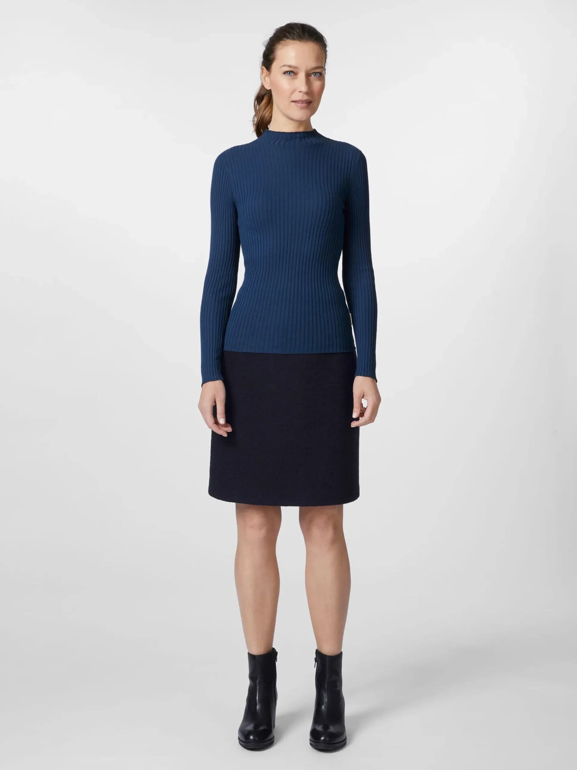 Dieser Strickpullover mit Stehkragen eignet sich geradezu ideal als Unterziehpullover, er kann aber genauso gut solo oder unter einem Blazer getragen werden. Gefertigt ist er aus einem breiten, sehr dehnbaren Rippenstrick, der sich gut an die Körperform anpasst und gleichzeitig viel Bewegungsfreiheit schenkt. Die verwendete Baumwolle stammt aus kontrolliert biologischem Anbau.