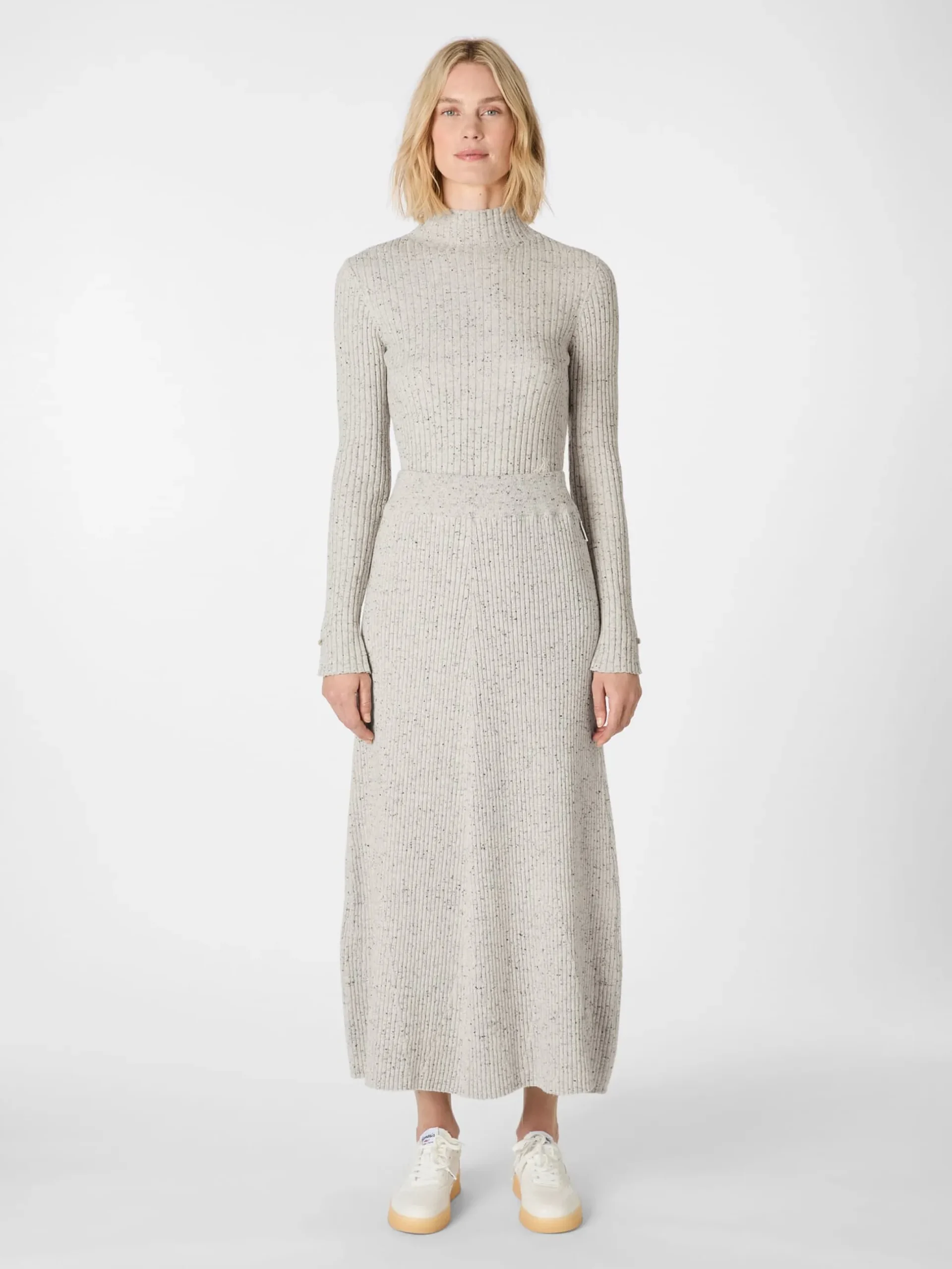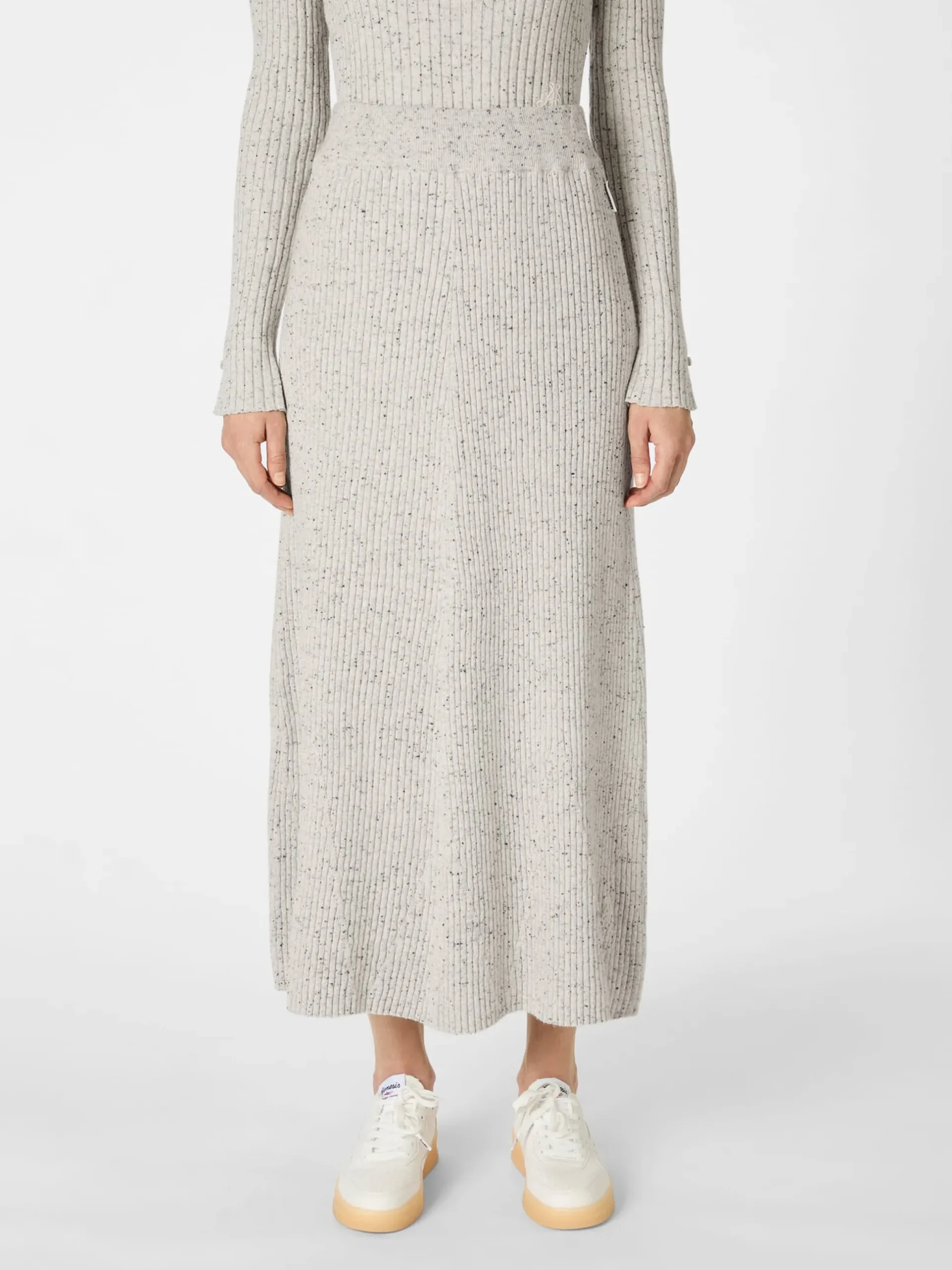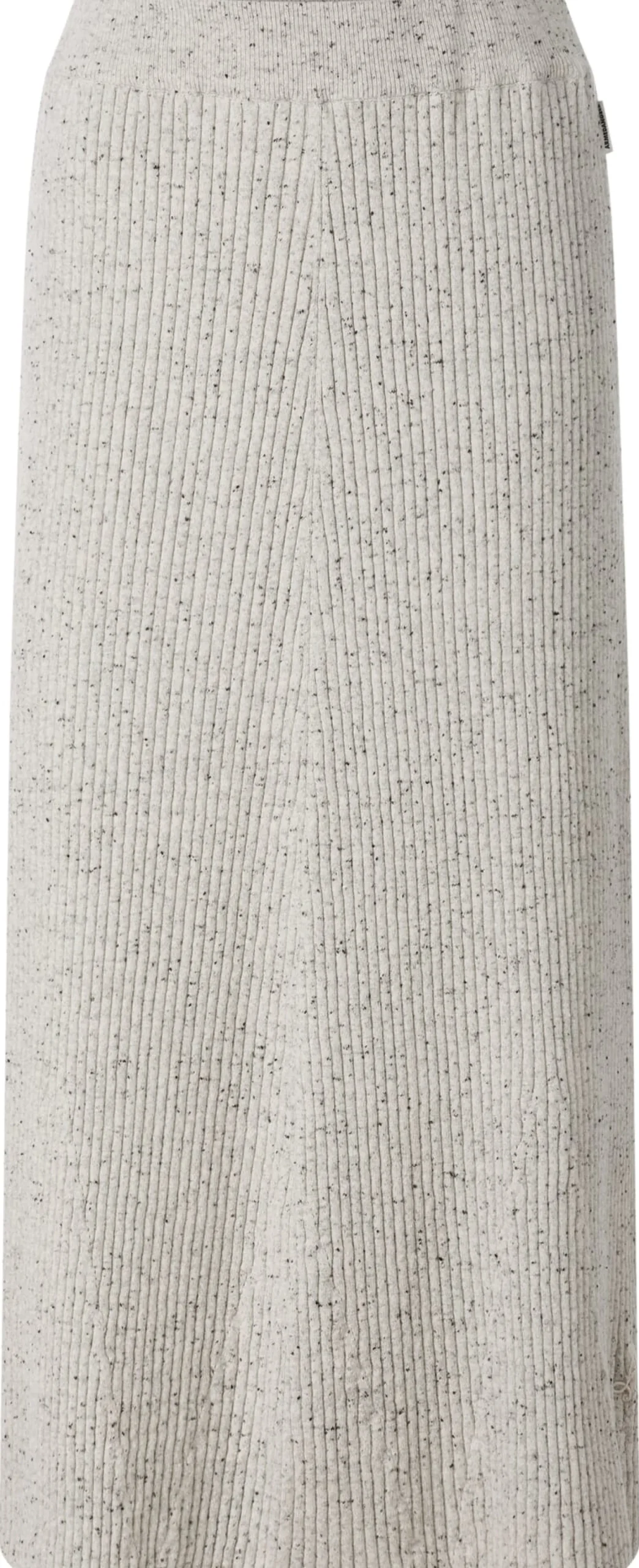 Kontrolliert biologisch angebaute Baumwolle und Lammwolle vereinen sich bei diesem Maxirock zu einem wunderbar weichen, wärmenden und temperaturausgleichenden Gestrick. Zudem ist der Rock dank des Rippenstricks luftdurchlässig, dehnbar und formstabil. Und durch die Kombination aus hellen und dunklen Garnen und den schwarzen Einsprengseln zeigt er eine lebendige Melangeoptik. Das weich fließende Gestrick und der Schnitt, der oben körpernah und nach unten hin etwas ausgestellt ist, verleihen ihm eine leichte Glockenform. Der elastische, in feinem Rippenstrick gefertigte Bund schmiegt sich sanft an die Taille und sorgt für einen guten Sitz. Ein eingesticktes Armedangels-Logo in verschlungener Formgebung rundet das Design ab. Sportlich-leger kombiniert mit Shirt und Sneakern oder elegant mit Bluse, Blazer und Loafern – der Rock macht stets eine gute Figur.