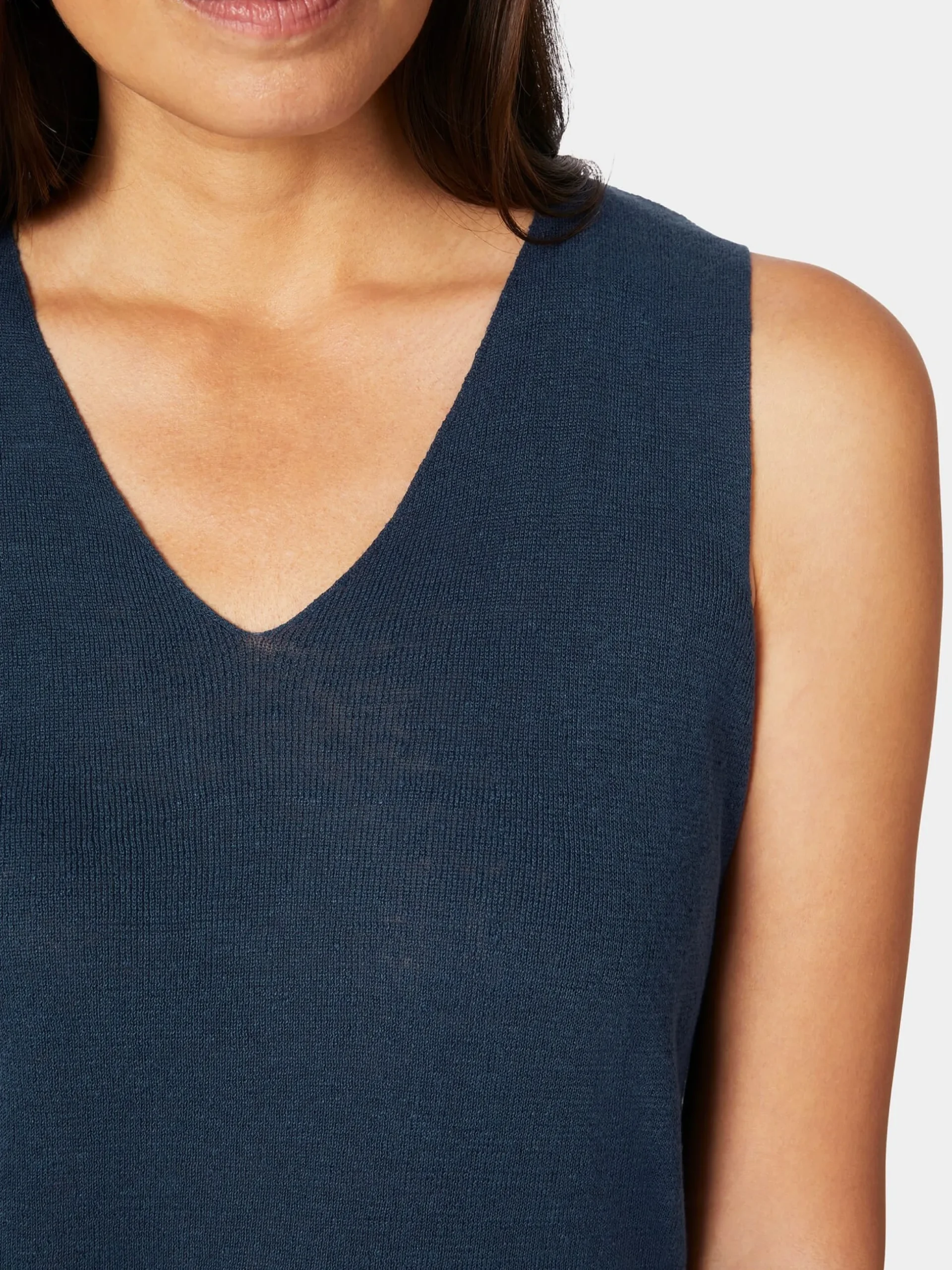 Ein Lieblingsstück für den Sommer: luftig-leicht, bequem und vielseitig zu kombinieren – ob mit Hose oder Rock, solo getragen oder unter einem Blazer. Auch die Materialwahl ist perfekt auf die warme Jahreszeit abgestimmt. Les Racines du Ciel verwendet hier eine Kombination, die zu 70 Prozent aus atmungsaktivem, kühlendem Leinen und zu 30 Prozent aus hautsympathischer, kontrolliert biologisch angebauter Baumwolle besteht. Das feine Gestrick zeigt eine leichte Transparenz und ist dehnbar, was den Tragekomfort noch erhöht. Gearbeitet ist das Stricktop mit breiten Trägern und V-Ausschnitt, im Nacken ist es hoch geschnitten. Seine lockere Passform sorgt für einen lässigen Sitz, der die Figur sanft umspielt.