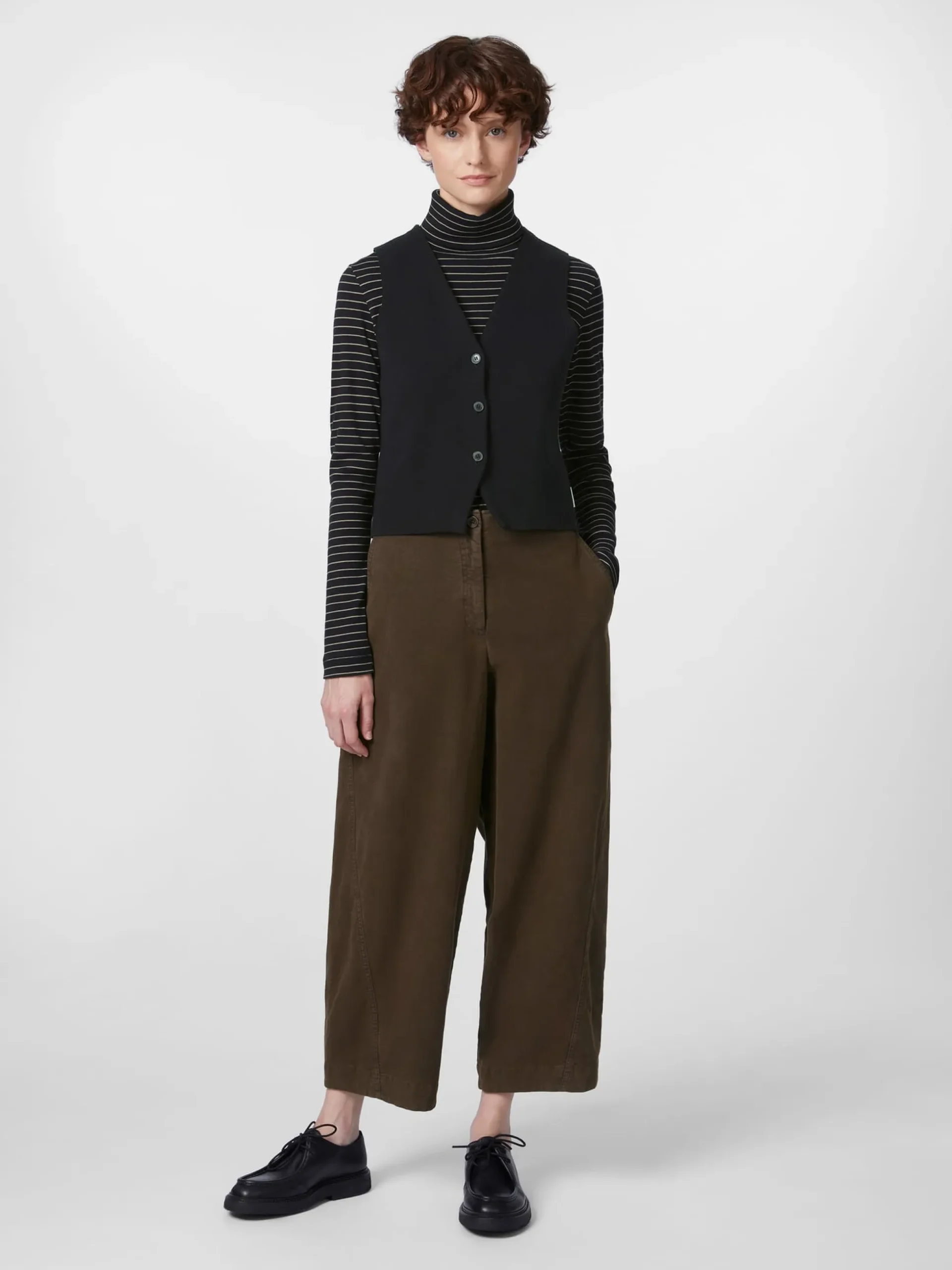 Feminine Weste in klassischer, figurnah geschnittener Form – kombiniert mit einer Bluse oder einem Langarmshirt darunter perfekt für den Lagenlook. Nicht ganz klassisch ist, dass sie gestrickt und nicht wie sonst üblich gewebt ist, was ihr einen hohen Tragekomfort und viel Bewegungsfreiheit verleiht. Armedangels fertigt sie hautsympathischer Baumwolle und einem Anteil Polyamid zugunsten der Elastizität und Formtreue. Markante Papierknöpfe runden das charaktervolle Erscheinungsbild ab.