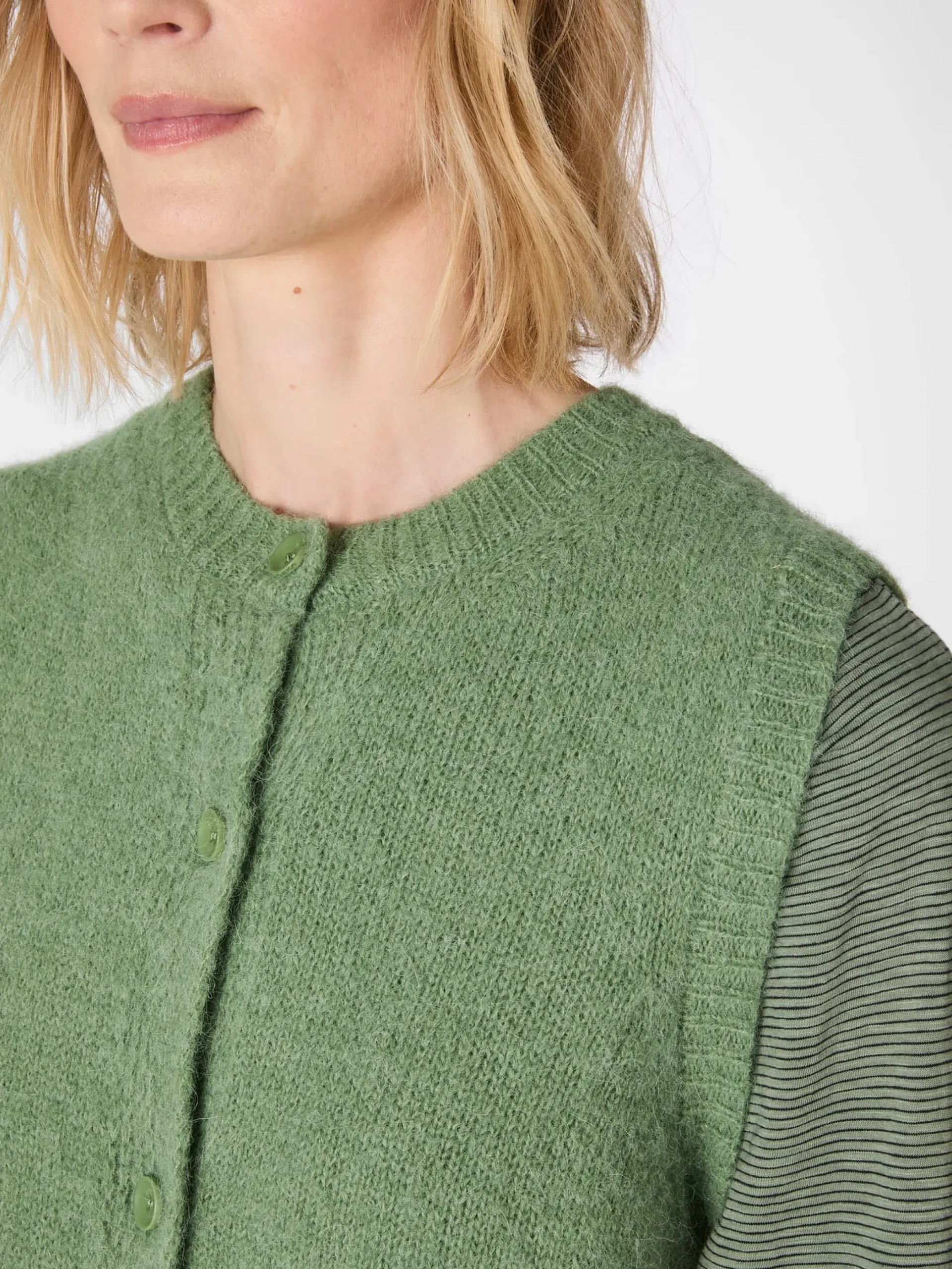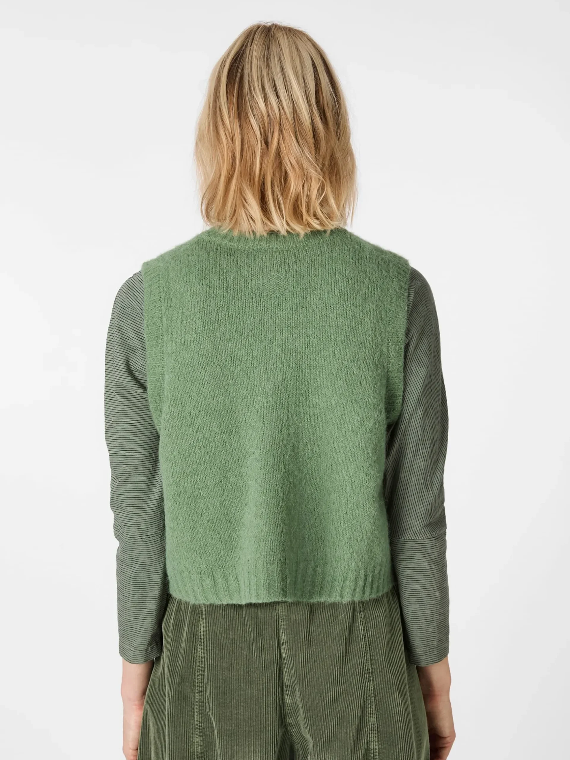 65% Alpaka, 35% Schurwolle. Steinnussknöpfe. Hergestellt in Bulgarien. Rückenlänge bei Größe 2 (40/42) = 43 cm.