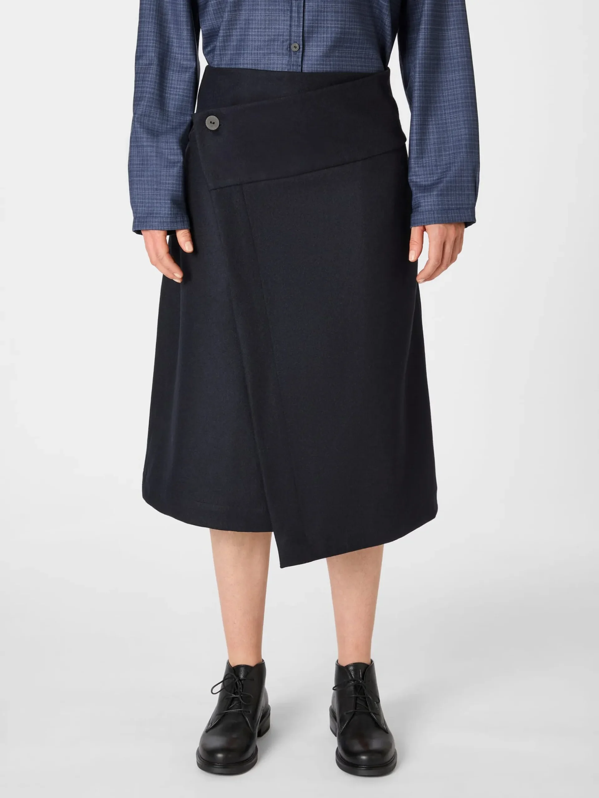 Perfekt für den Herbst oder kühle Frühlingstage: ungefütterter Wickelrock, gefertigt aus einem dichten, wärmenden Wolltuch. Er wird mit einem in Japan handgefertigten Papierknopf asymmetrisch geschlossen, was seine A-Linie noch unterstreicht und für eine raffinierte Optik sorgt. Ausgestattet ist der Rock mit zwei Seitennahttaschen. Die große, tief angesetzte Gesäßtasche und das handgestickte Dreieck am rückseitig angebrachten Riegel – Markenzeichen von Christiane Strobel – verleihen dem Rock das gewisse Etwas. Er lässt sich vielseitig kombinieren, ob zu eleganten, sportlichen oder lässigen Outfits.