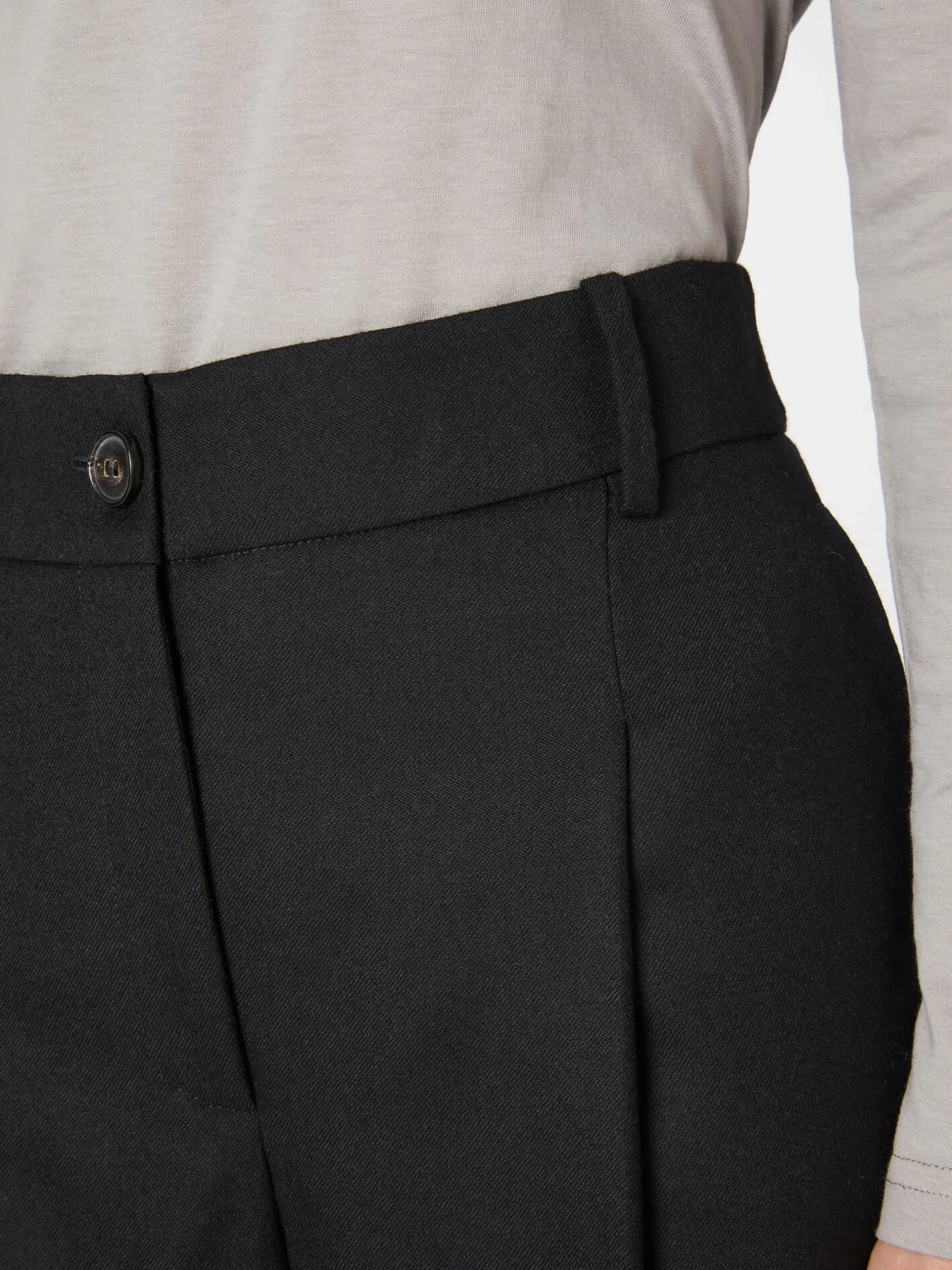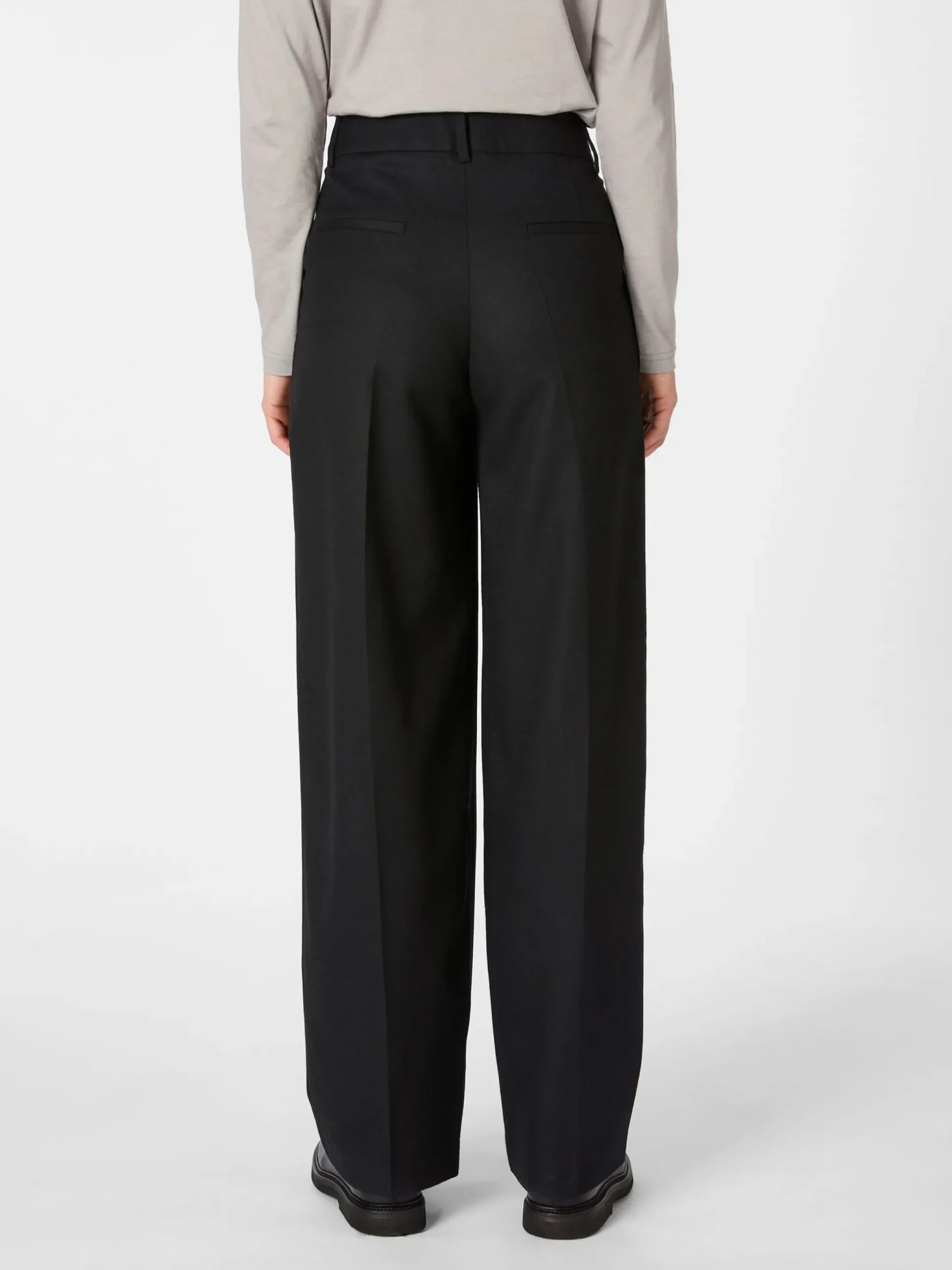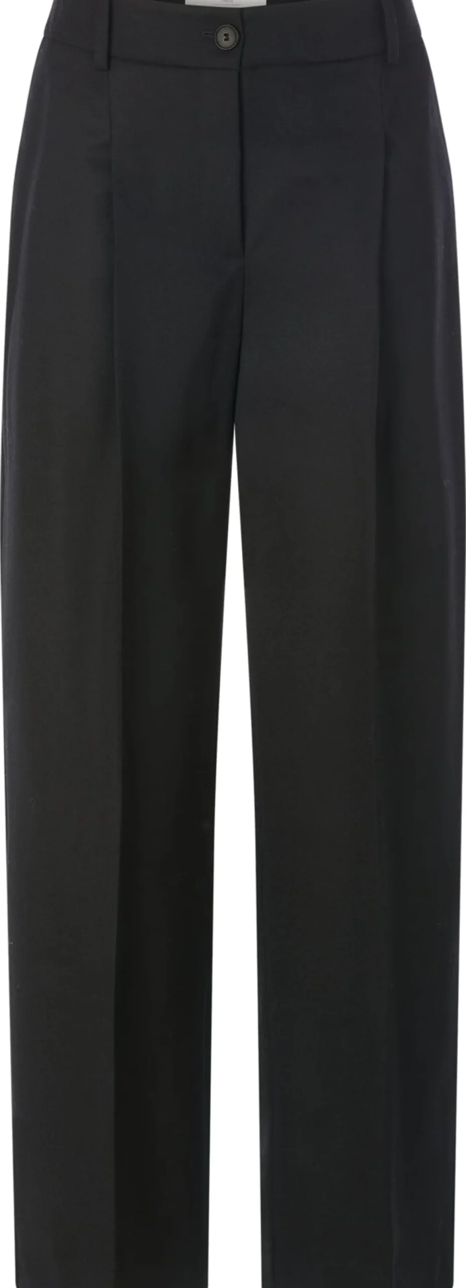 Schlicht und klassisch im Stil sorgt diese Wollhose für einen eleganten Auftritt. Auch in puncto Materialwahl weiß sie zu überzeugen. Lanius fertigt sie aus reiner Schurwolle aus kontrolliert biologischer Tierhaltung. Das wärmende Gewebe hat einen schmiegsamen Griff und zeigt einen feinen Köpergrat. Dank des komfortablen Schnitts mit weitem, geradem Bein, je einer Bundfalte auf jeder Seite und Bügelfalten vorn und hinten formt die Hose eine schmeichelhafte Silhouette. Geschlossen wird sie mit Reißverschluss und einem markanten Hornknopf. Die seitlichen Taschen bieten nicht nur Platz für Kleinigkeiten, sondern fügen sich harmonisch in das Gesamtbild ein. Blinde Gesäßtaschen runden das Design ab.