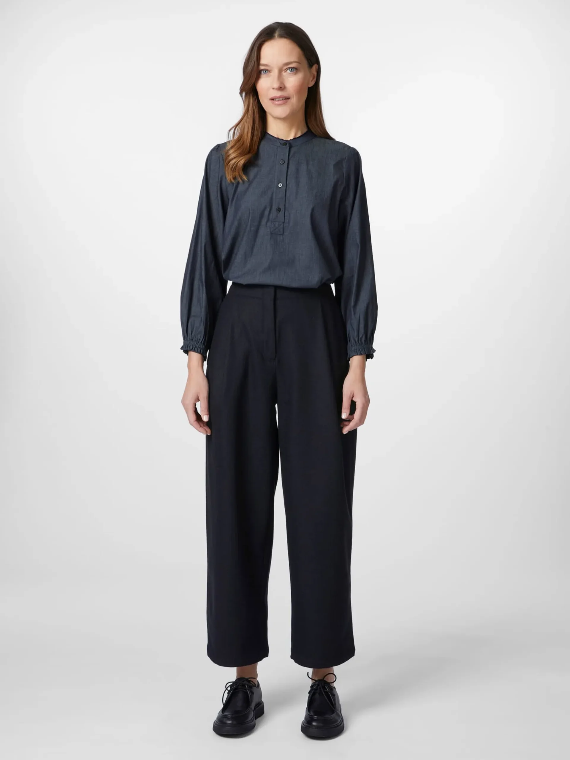 Dank ihrer legeren Passform mit geradem weitem Bein ist diese Hose eine gute Alltagsbegleiterin, die sich je nach Anlass und Aktivität perfekt mit einer Bluse, einem Pullover oder einem Shirt kombinieren lässt. Das strapazierbare und feste Gewebe besteht aus reiner Wolle – es ist wärmend und temperaturausgleichend. Die Hose ist mit zwei Seitentaschen und zwei großen aufgesetzten Gesäßtaschen ausgestattet. Geschlossen wird sie mit Kunststoffreißverschluss, Hosenhaken und Knopf. Eine Bundfalte auf jeder Seite sorgt für eine gute Passform und einen bequemen Sitz.
