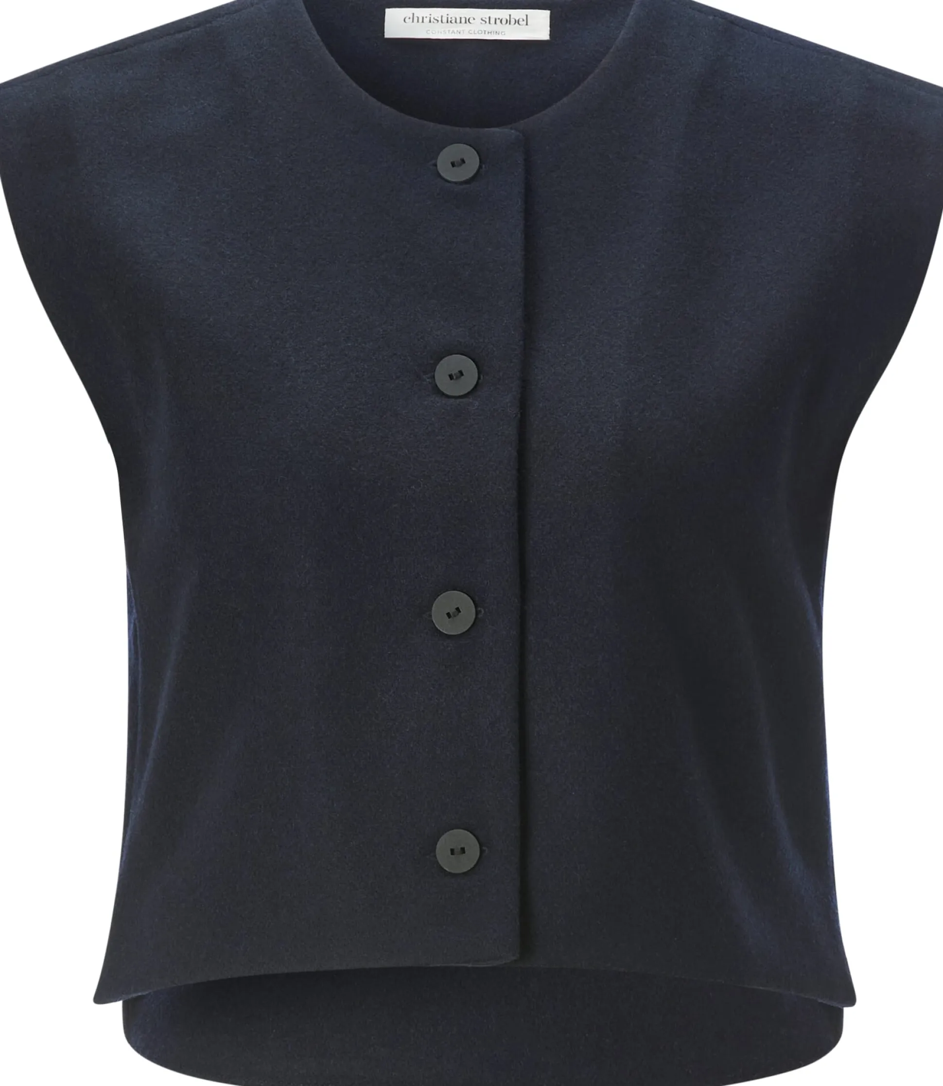 Diese wärmende, ungefütterte Weste konfektioniert Christiane Strobel aus einem dicht gewebten Tuch aus reiner Wolle. Der leicht antaillierte Schnitt und die Längsteilungsnaht im Rücken verschlanken die Silhouette optisch. Der Rumpfsaum ist vorn gerade und hinten gerundet. Seitenschlitze sorgen für mehr Bewegungsfreiheit. Kombiniert mit Bluse und Businesshose oder -rock im gleichen Farbton passt die Weste perfekt zu klassischen, eleganten Outfits. Im Mix mit Jeans und Shirt setzt sie legeren Looks das i-Tüpfelchen auf. Zu den markanten Details gehören die in Japan handgefertigten Papierknöpfe und das handgestickte Dreieck am rückseitig angebrachten Riegel.