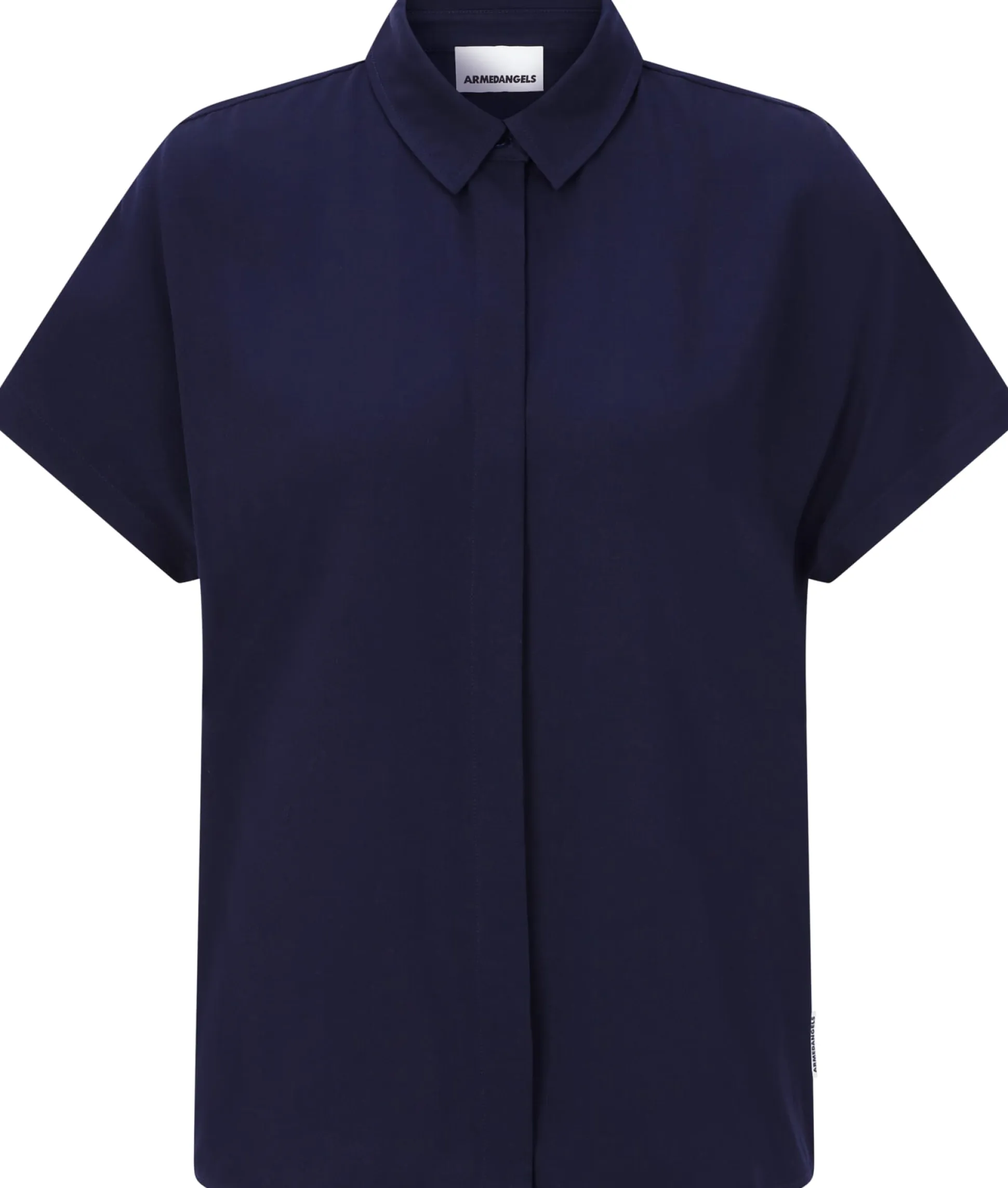 Diese Bluse ist dank des verwendeten Materials perfekt auf die warme Jahreszeit abgestimmt. Armedangels fertigt sie aus reiner LENZING™ ECOVERO™-Viskose, einer Regeneratfaser, die aus Holz und Zellstoff aus zertifizierten Quellen gewonnen wird. Das hautsympathische Gewebe hat eine schmiegsame Haptik und einen fließenden Fall, so wird die Figur weich umspielt. Zudem ist der Stoff besonders atmungsaktiv, da Viskose viel Feuchtigkeit aufnehmen und schnell wieder nach außen abgibt. Gearbeitet ist die Bluse mit Hemdkragen, verdeckter Knopfleiste und kurzen Ärmeln.