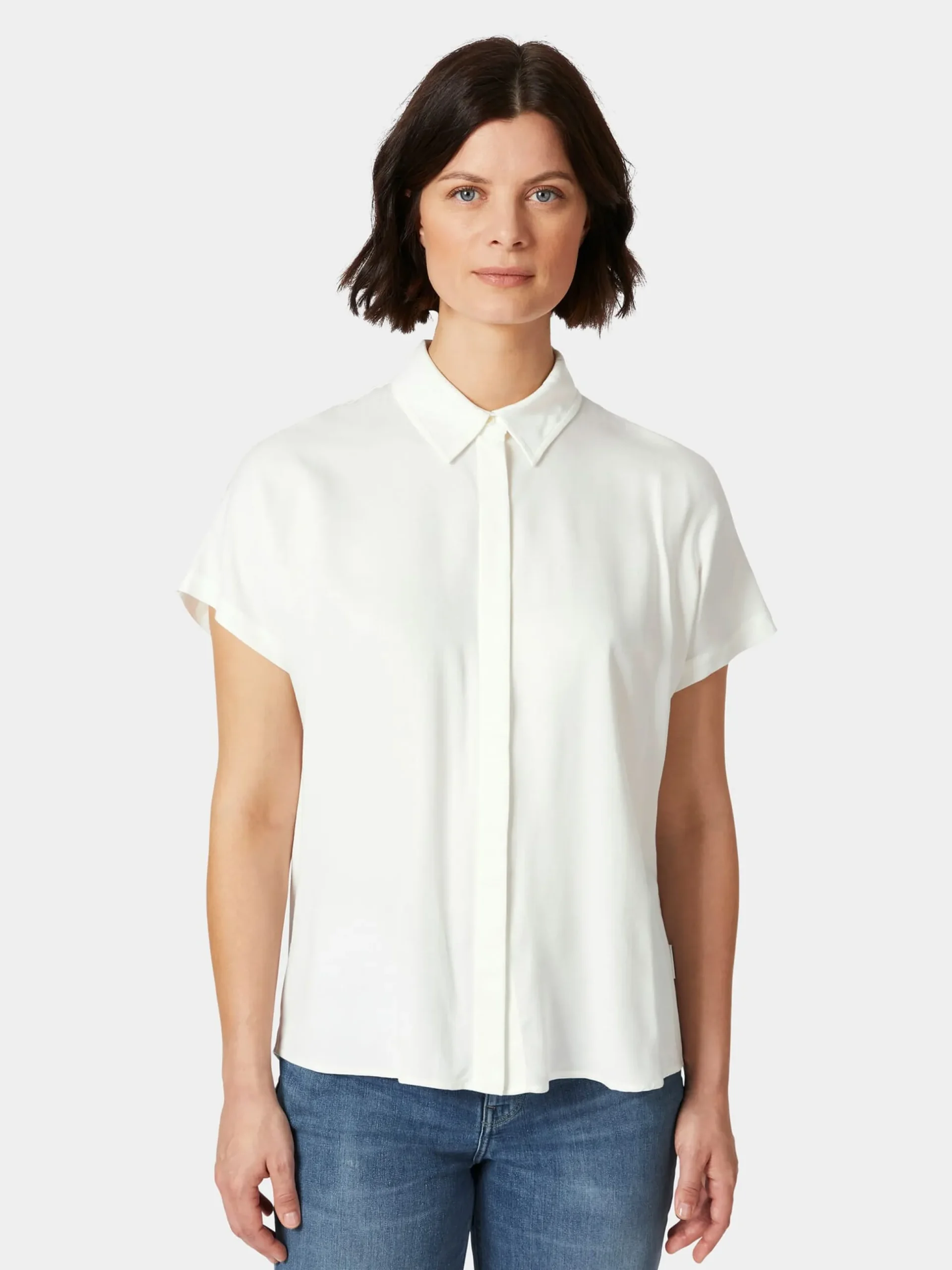 Diese Bluse ist dank des verwendeten Materials perfekt auf die warme Jahreszeit abgestimmt. Armedangels fertigt sie aus reiner LENZING™ ECOVERO™-Viskose, einer Regeneratfaser, die aus Holz und Zellstoff aus zertifizierten Quellen gewonnen wird. Das hautsympathische Gewebe hat eine schmiegsame Haptik und einen fließenden Fall, so wird die Figur weich umspielt. Zudem ist der Stoff besonders atmungsaktiv, da Viskose viel Feuchtigkeit aufnehmen und schnell wieder nach außen abgibt. Gearbeitet ist die Bluse mit Hemdkragen, verdeckter Knopfleiste und kurzen Ärmeln.