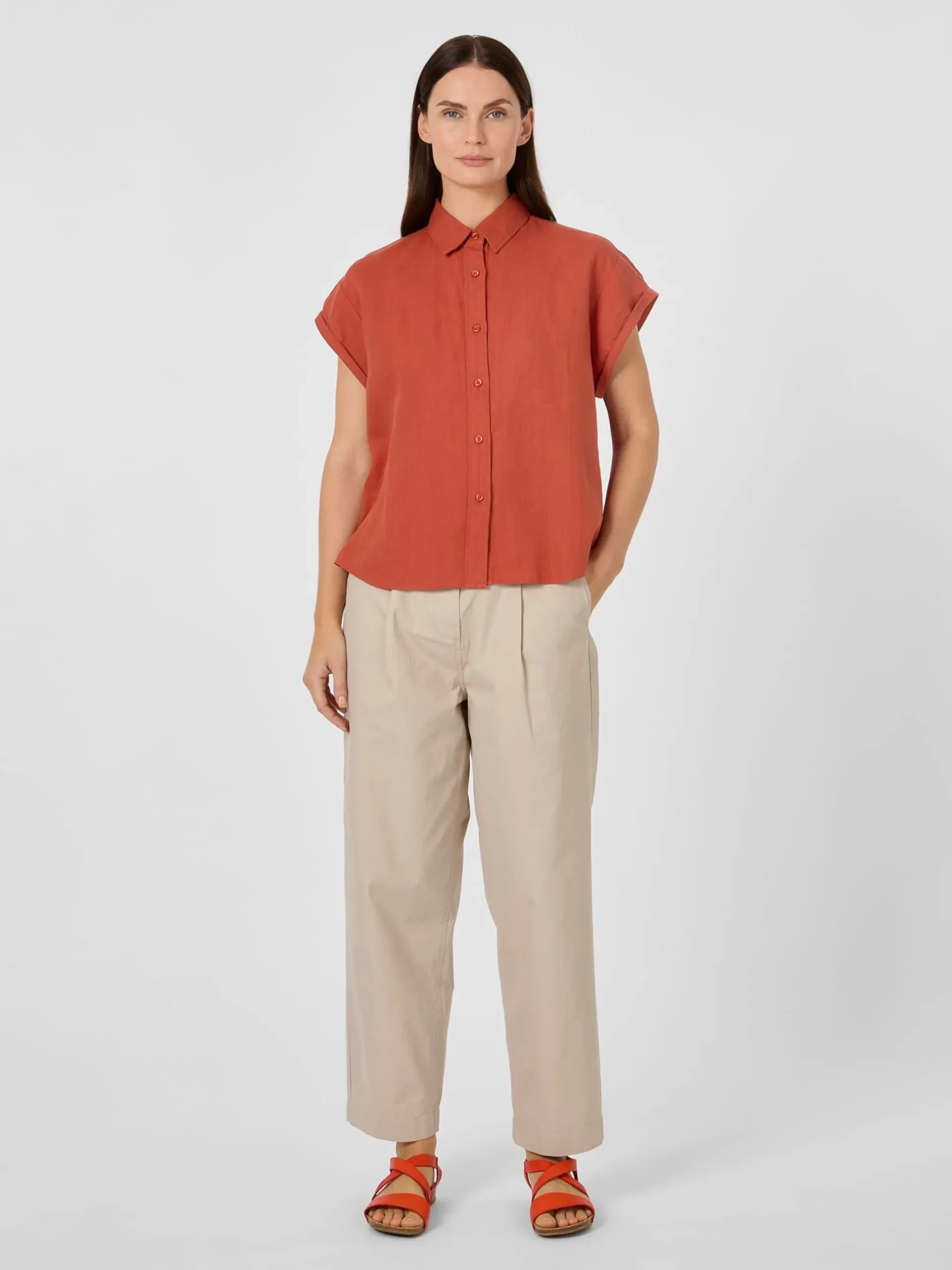 Leinen ist dank seiner kühlenden Trageeigenschaften das Material der Wahl für die warme Jahreszeit. Bei dieser gerade geschnittenen Bluse verwendet Knowledge Cotton Apparel Leinen aus kontrolliert biologischem Anbau. Gearbeitet ist sie mit überschnittenen Schultern, sehr kurzen Ärmeln mit Aufschlag und rundem Saum. Das Gewebe ist leicht und luftig und zeigt den materialtypischen Edelknitter.