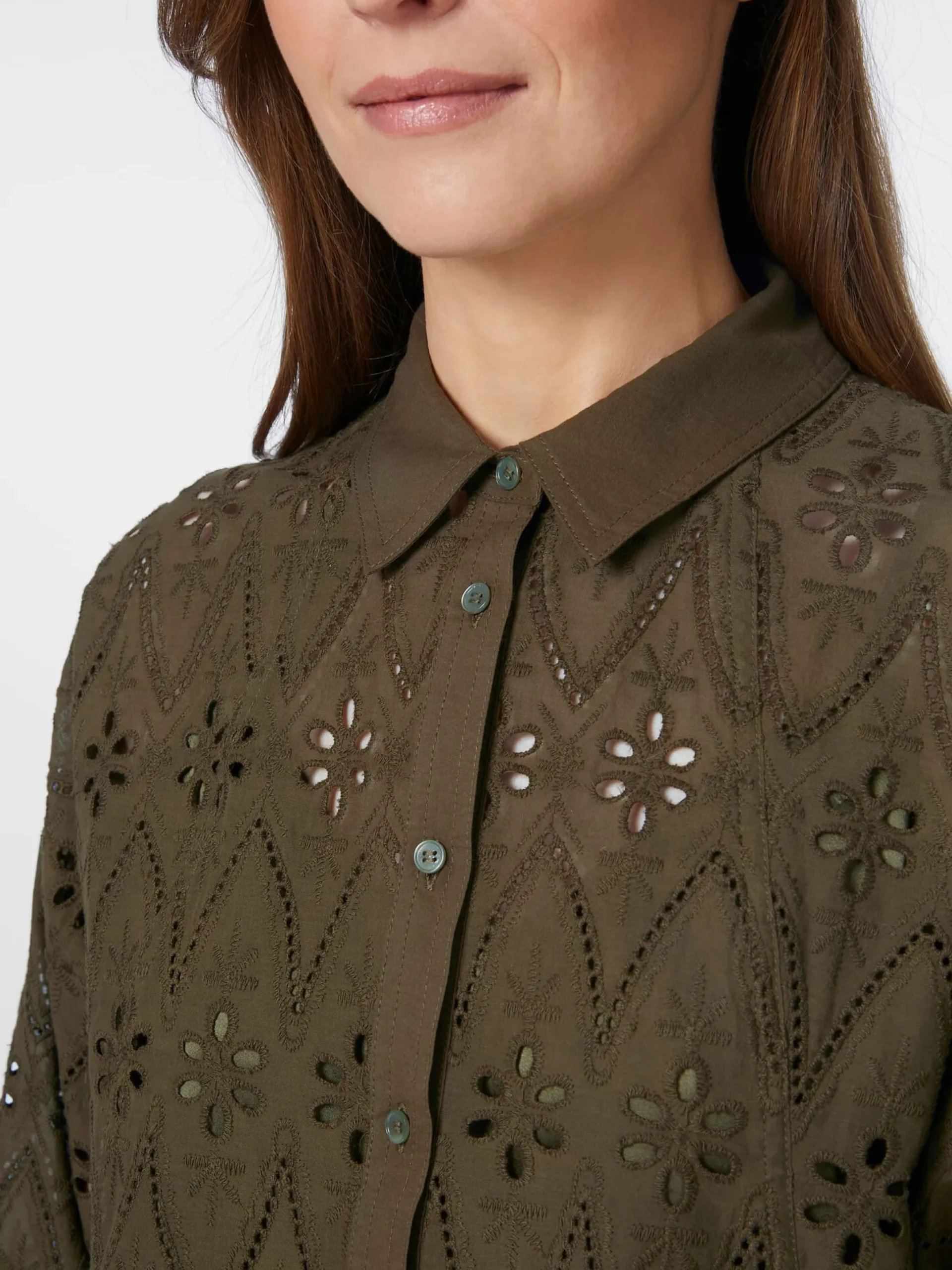 Das durchbrochene Muster mit floralen und geometrischen Motiven verleiht dieser Bluse eine feine Transparenz. Der Schnitt ist gerade und leger gehalten und der Blusenstoff besteht aus hautsympathischer, kontrolliert biologisch angebauter Baumwolle, was für einen hohen Tragekomfort sorgt. Gearbeitet ist die Bluse mit durchgehender Knopfleiste, klassischem Hemdkragen und langen Ärmeln mit geknöpften Manschetten. Der gewellte Saum und die grün schimmernden Perlmuttknöpfe runden das Design ab. Für weniger Transparenz lässt sich die Bluse mit einem Unterzieh-Top kombinieren – am besten in ähnlicher Farbstellung oder in Schwarz.