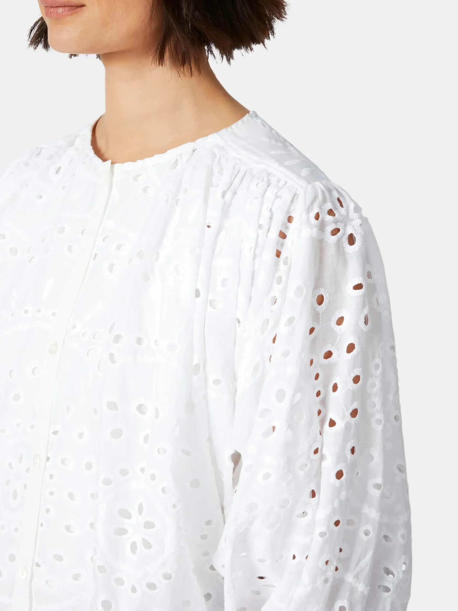 Diese luftige Bluse mit Lochstickereien in der Tradition der Broderie anglaise (französisch für englische Stickerei), verleiht Ihrem Outfit eine feminine Note. Die Textiltechnik stammt ursprünglich aus Osteuropa, war aber im 19. Jahrhundert vor allem in England populär, daher ihr Name. Der Stoff, den Lanius hier verwendet, zeigt ein filigranes, durchbrochenes Muster aus zart umstickten Löchern, die in floralen und geometrischen Formen angeordnet sind und eine feine Transparenz bewirken. Die verwendete Baumwolle stammt aus kontrolliert biologischem Anbau. Gearbeitet ist die Bluse in bequemer, überschnittener Passform mit gerundetem Saum. Die weiten, geknöpften Pumpärmel und die gekräuselten Partien an der Schulter vorn und unter der hinteren Schulterpasse unterstreichen den femininen Look und sorgen für einen schönen und weichen Fall, der die Figur sanft umspielt.