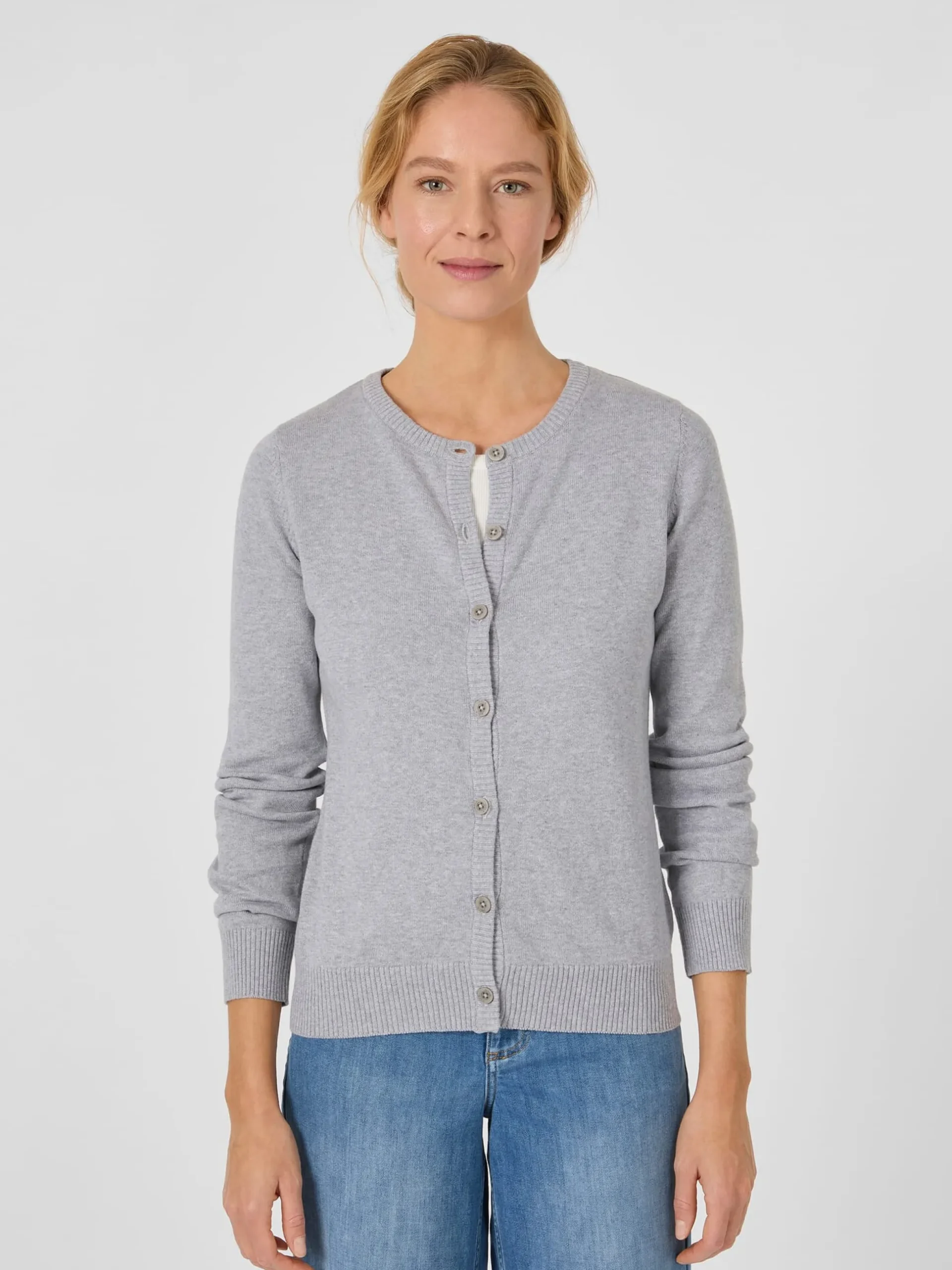 Zeitlos klassisch ist dieser Cardigan und dank des verwendeten Materials ein guter Begleiter für die Übergangszeit oder kühle Sommerabende. Das feine Gestrick besteht aus reiner, kontrolliert biologisch angebauter Baumwolle, was es hautsympathisch und atmungsaktiv macht. Gearbeitet ist der Cardigan in hüftlanger, gerader Passform, mit Rippenstrickpartien an Hals, Ärmeln, Knopfleiste und Rumpf. Farblich passende Steinnussknöpfe runden das Design ab.