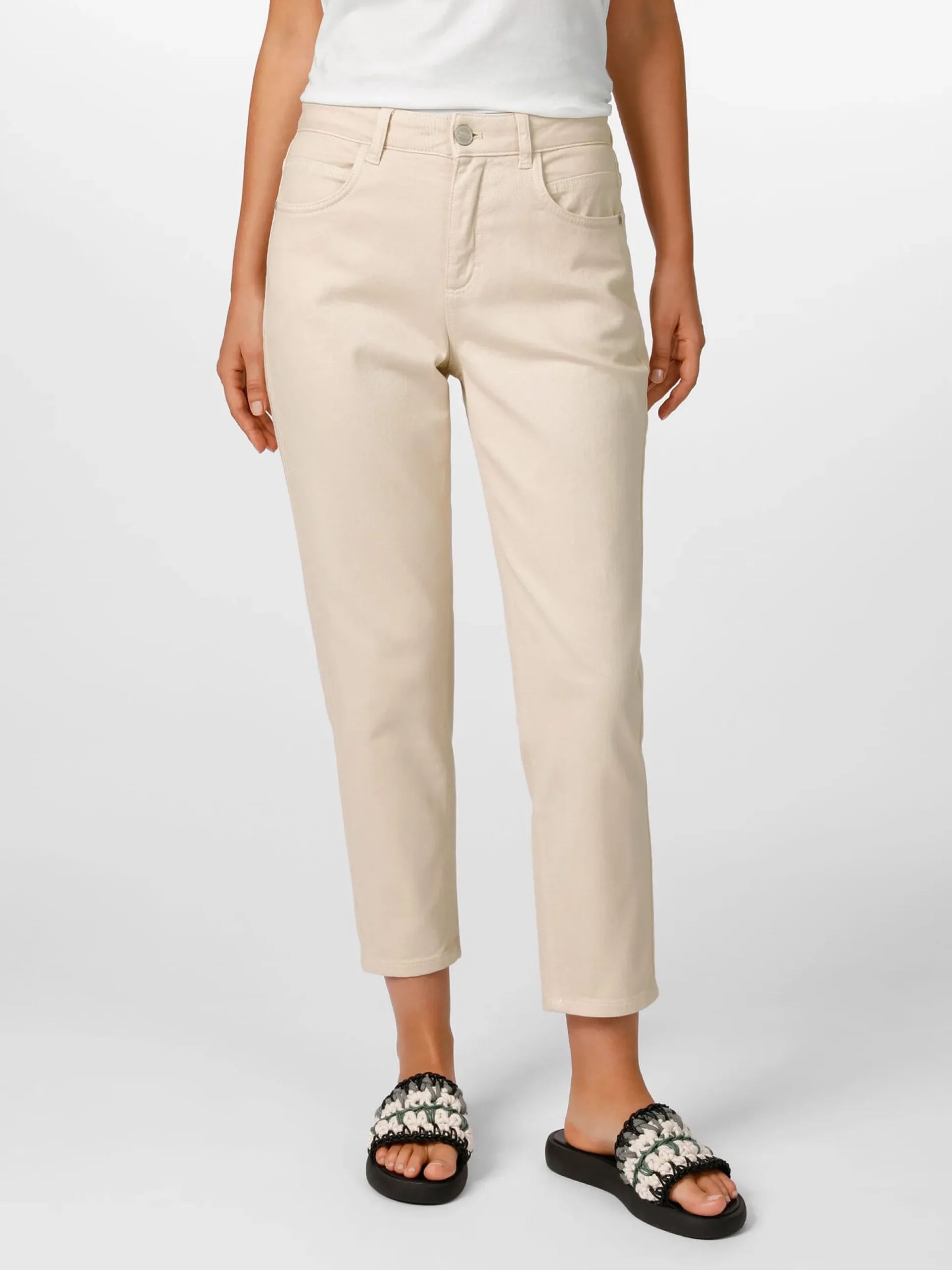 Hosen mit O-Form zeichnen sich durch großzügige, aber figurfreundliche Schnitte aus, wodurch sie bequem sind, ein hohes Maß an Bewegungsfreiheit bieten und zugleich die Figur optisch etwas schlanker wirken lassen. Lanius fertigt diese Hose in O-Form aus kontrolliert biologisch angebauter Baumwolle, etwas Elastan erhöht Tragekomfort und Formtreue. Der Stoff zeigt einen markanten Köpergrat, was der in 7/8-Länge gefertigten Hose einen sportlichen Charakter gibt. Die Hose wird mittels Reißverschluss und Knopf geschlossen, sie ist mit zwei Seitentaschen und zwei aufgesetzten Gesäßtaschen ausgestattet.