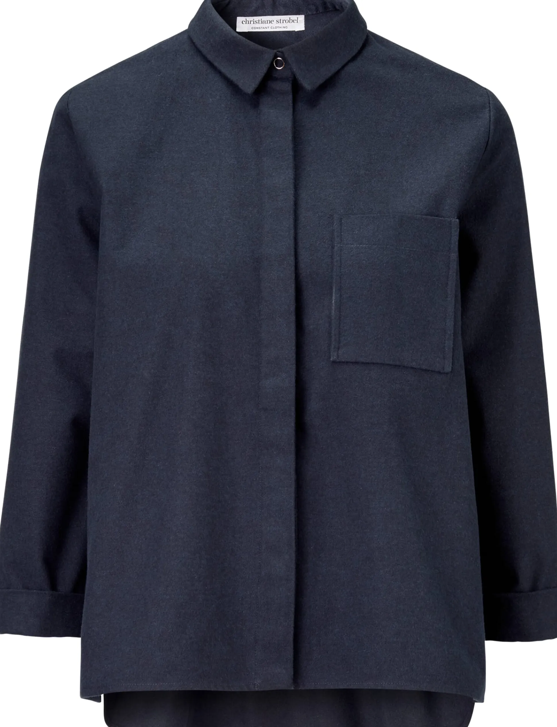Weich, griffig und hautsympathisch – ideal für etwas kühlere Tage. Diese leicht überschnittene Flanelljacke fertigt Christiane Strobel aus kontrolliert biologisch angebauter Baumwolle. Ausgestattet ist sie mit tief angesetzter Brusttasche, verdeckter Druckknopfleiste und geschlitzten Manschetten, die sich gut krempeln lassen. Der vordere Teil ist etwas kürzer und mit geradem Rumpfsaum, während der etwas längere hintere Teil mit gerundetem Rumpfsaum gearbeitet ist, was den legeren Schnitt der Jacke unterstreicht. Weitere markante Details sind die gekräuselte Partie unter der Schulterpasse, der ungewöhnliche Kragen, der vorn als Kentkragen und hinten als Stehkragen erscheint, und das handgestickte Dreieck am rückseitig angebrachten Riegel.