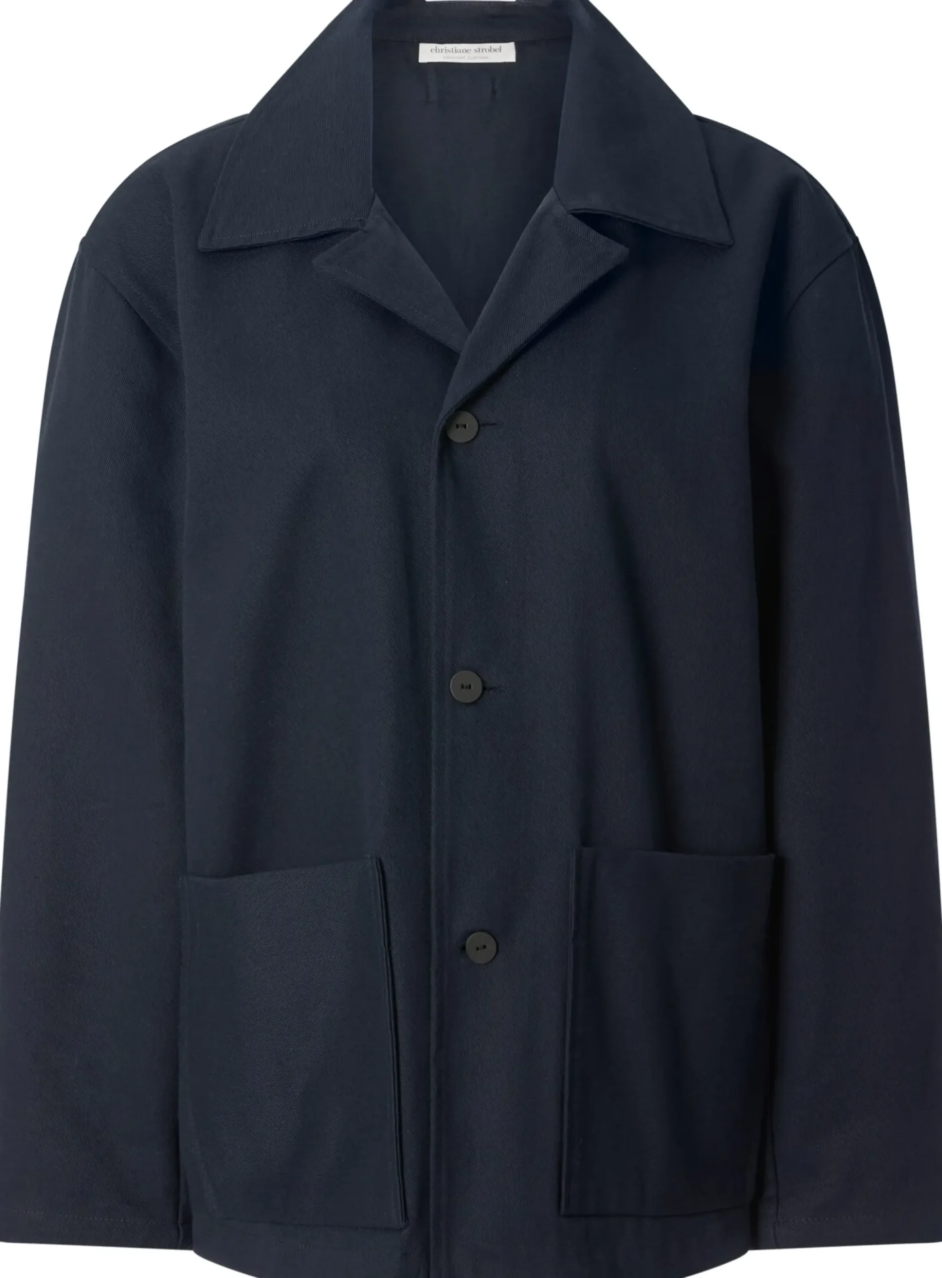 Diese gerade geschnittene Damenjacke im Stil einer Arbeitsjacke punktet durch ihre bequeme Passform und ihre lässige Optik. Für den robusten Twill verwendet Christiane Strobel hautsympathische, kontrolliert biologisch angebaute Baumwolle. Das dichte Gewebe hat einen kräftigen Griff und zeigt einen deutlichen, schräg verlaufenden Köpergrat. Ausgestattet ist die Jacke mit zwei großen aufgesetzten Taschen und markanten, in Japan handgefertigten Papierknöpfen. Besonders ist auch der Kragen, der vorn als Reverskragen erscheint und im Nacken unterbrochen ist, wodurch dort nur der Kragensteg sichtbar ist.