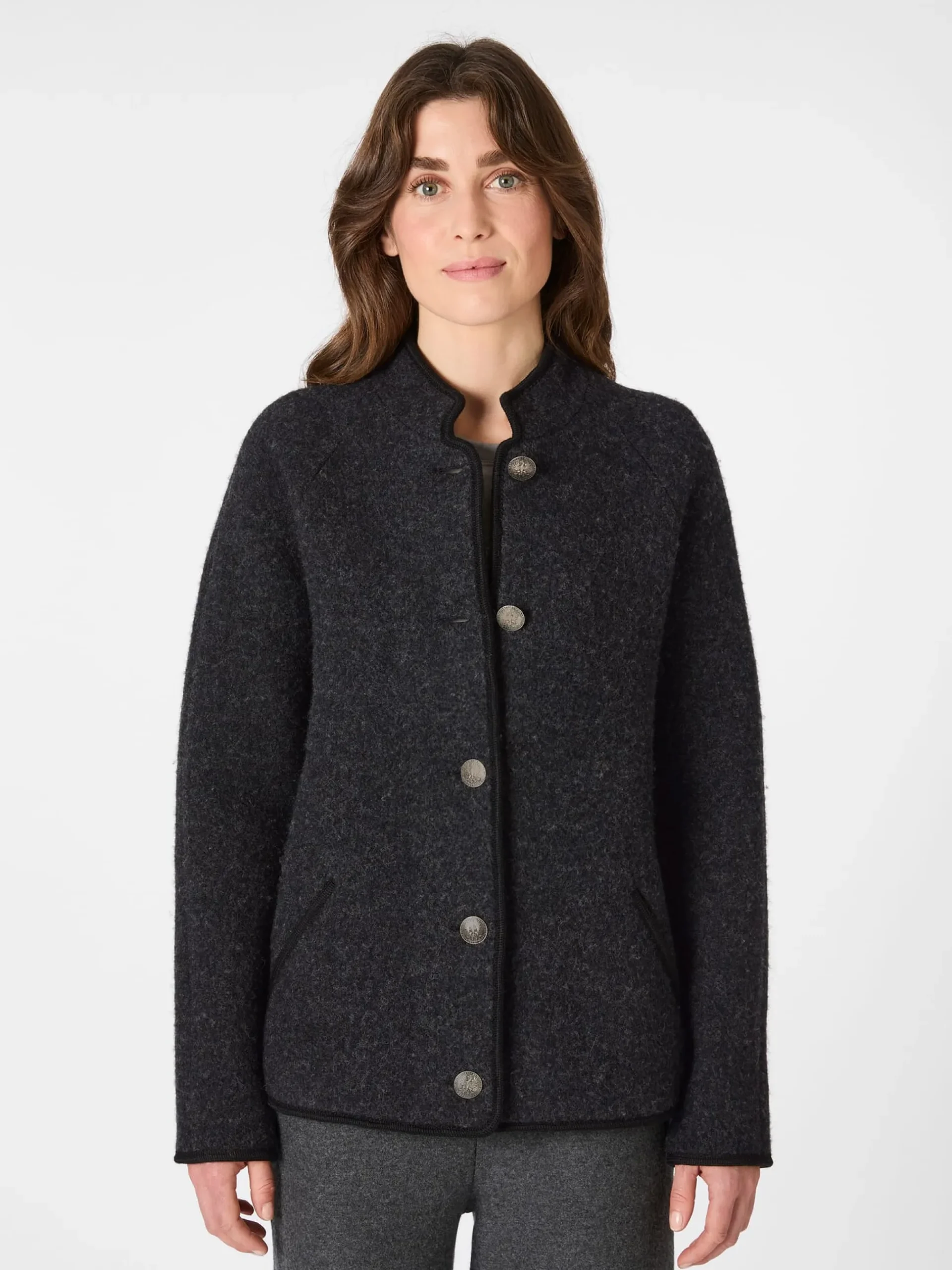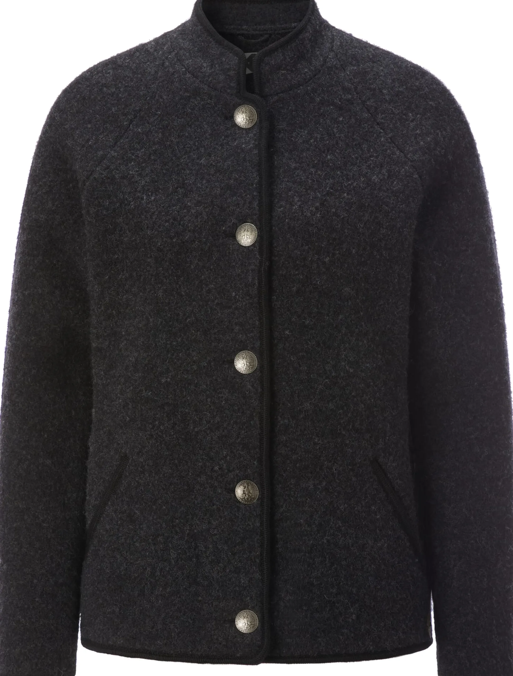 Dieser klassische Janker aus strapazierbarem Schurwollwalk bietet eine gute Wärmeisolation und ist gleichzeitig temperaturausgleichend – also perfekt für die Übergangszeit. Er lässt sich ganz traditionell mit Kleid oder Rock kombinieren, passt aber ebenso gut zu Jeans oder Chino. Der körpernahe Schnitt formt eine schöne feminine Silhouette ohne einzuengen, denn das gewalkte Gestrick ist trotz seiner Festigkeit elastisch; gleichzeitig ist es formstabil. Gearbeitet ist der Janker mit schmalem Stehkragen, schrägen Einschubtaschen und Raglannaht an den Ärmeln. Eine zusätzliche Oberarmnaht sorgt für einen guten Sitz. Eine besondere Note verleihen ihm die handgestrickten Borten an Kragen, Knopfleiste Tascheneingriffen, Rumpfsaum und Ärmelbündchen. Die Jacke wird mit stilvollen, silberfarbenen Münzknöpfen geschlossen, die nach dem Motiv des Frankfurter Talers von 1764 gestaltet sind.