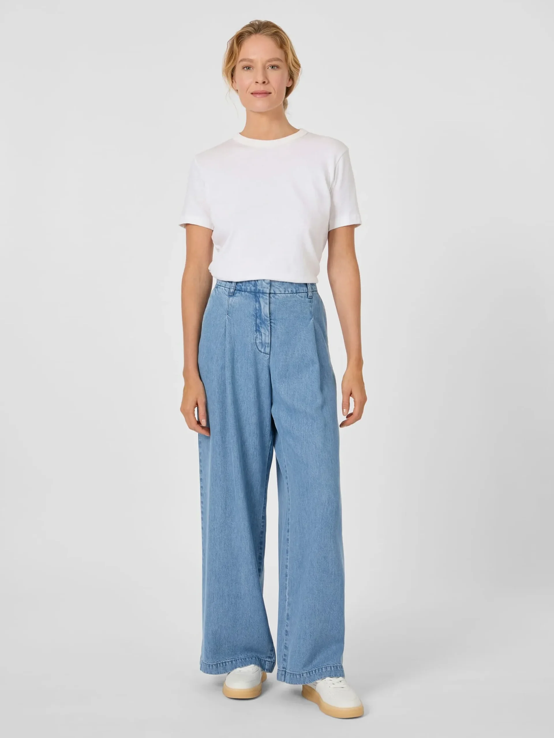 Jeanshosen bestehen gewöhnlich aus Baumwolle, dieses lässige Modell wird jedoch aus reinem Lyocell (TENCEL™) gefertigt, einer Regeneratfaser, die aus Holz gewonnen wird, das aus zertifizierten und kontrollierten Quellen stammt. Das Lyocell-Gewebe liegt schmiegsam auf der Haut und hat einen schönen weichen Fall. Zudem ist es besonders atmungsaktiv, daher trägt sich die Jeans auch bei höheren Temperaturen sehr angenehm. Sie ist mit mittelhohem Bund, sehr weitem Bein, zwei Seitentaschen und einer blinden Gesäßtasche gearbeitet und wird mit Reißverschluss und Knopf geschlossen. Eine Bundfalte auf jeder Seite sorgt für einen guten und bequemen Sitz.