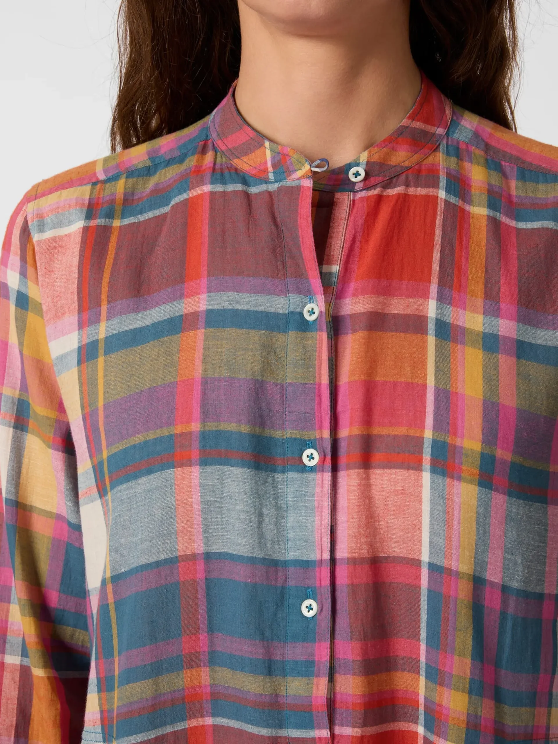 Dieses farbenfroh karierte Midikleid fertigt Moismont aus reiner, hautsympathischer Baumwolle. Das feine Gewebe hat einen weichen Fall und liegt angenehm leicht und luftig auf der Haut. Gearbeitet ist das wadenlange Kleid in weiter, figurumspielender Passform, mit Stehkragen und leicht gerundetem Saum. Der leicht ausgestellte Schnitt verleiht ihm einen dezenten Schwung. Die langen Ärmel mit knöpfbaren Manschetten können auch gut gekrempelt getragen werden. Eine gelegte Falte unter der Knopfleiste und eine Quetschfalte unter der Schulterpasse sorgen für einen guten Sitz und zusätzliche Bewegungsfreiheit, wozu auch die langen Seitenschlitze beitragen. Diese sind im oberen Bereich geknöpft und lassen sich so je nach Bedarf in der Länge anpassen. Zwei in die Seitennaht eingesetzte Taschen nehmen Kleinteile des täglichen Bedarfs auf. Ein eingesticktes, florales Moismont-Logo rundet das Design ab.