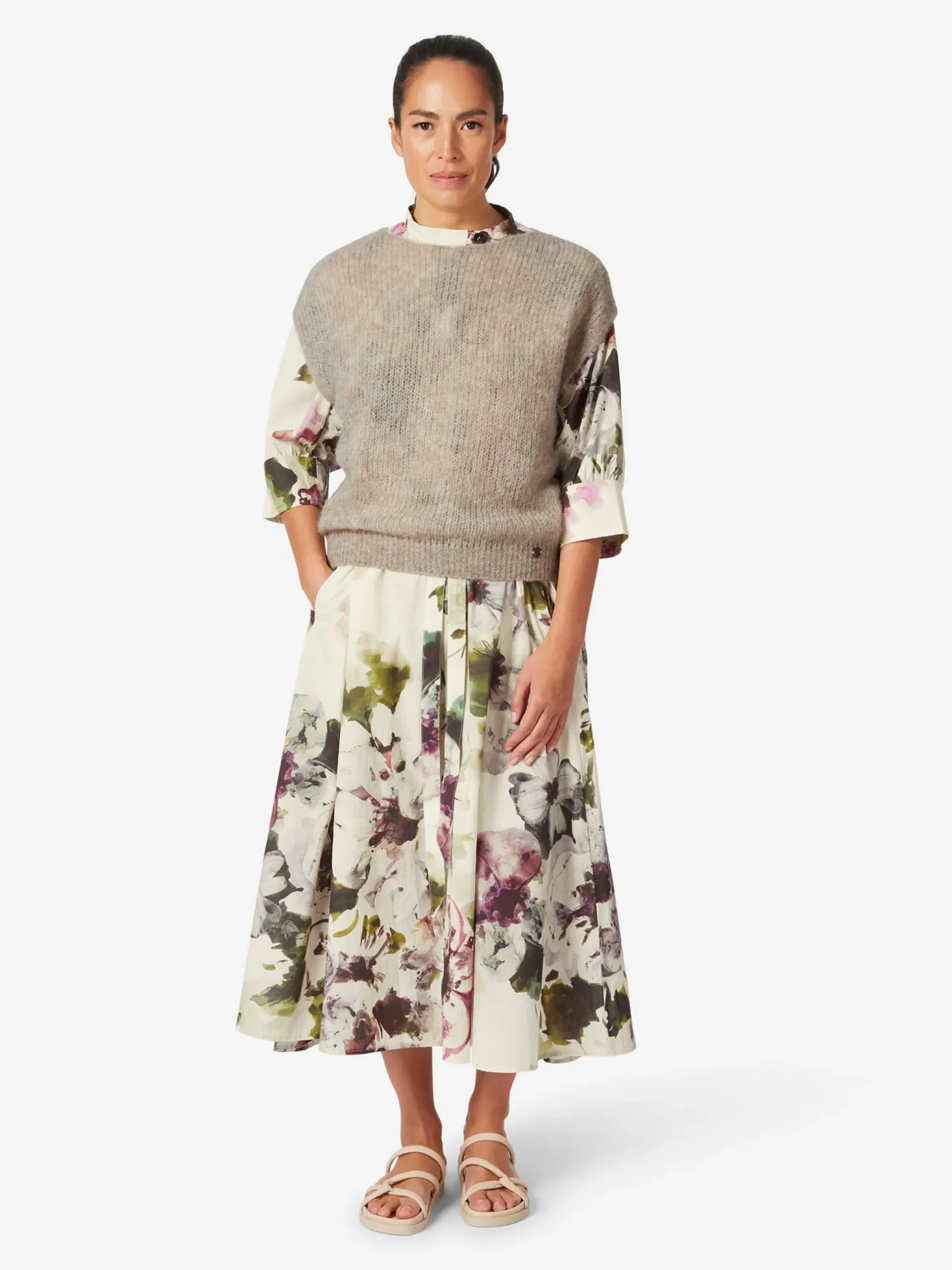 Sein lebhaftes, großblumiges Printmuster in frühlingsfrischen Farben macht dieses Kleid zum Hingucker. Hannes Roether fertigt es aus hautsympathischer, atmungsaktiver Baumwolle. Die legere, ausgestellte Passform verleiht dem Kleid Schwung und bietet viel Bewegungsfreiheit, wozu auch die aufspringende Kellerfalte unter der hinteren Schulterpasse beiträgt. Das Bindeband aus Oberstoff wird hinten geknöpft und erlaubt eine Weitenanpassung auf Taillenhöhe. Gearbeitet ist das ungefütterte Kleid mit Stehkragen, verdeckter Knopfleiste und halblangen Ärmeln mit gedoppelten, knöpfbaren Manschetten. Zwei in die Seitennaht eingesetzten Taschen bieten Platz für Kleinteile des täglichen Bedarfs.