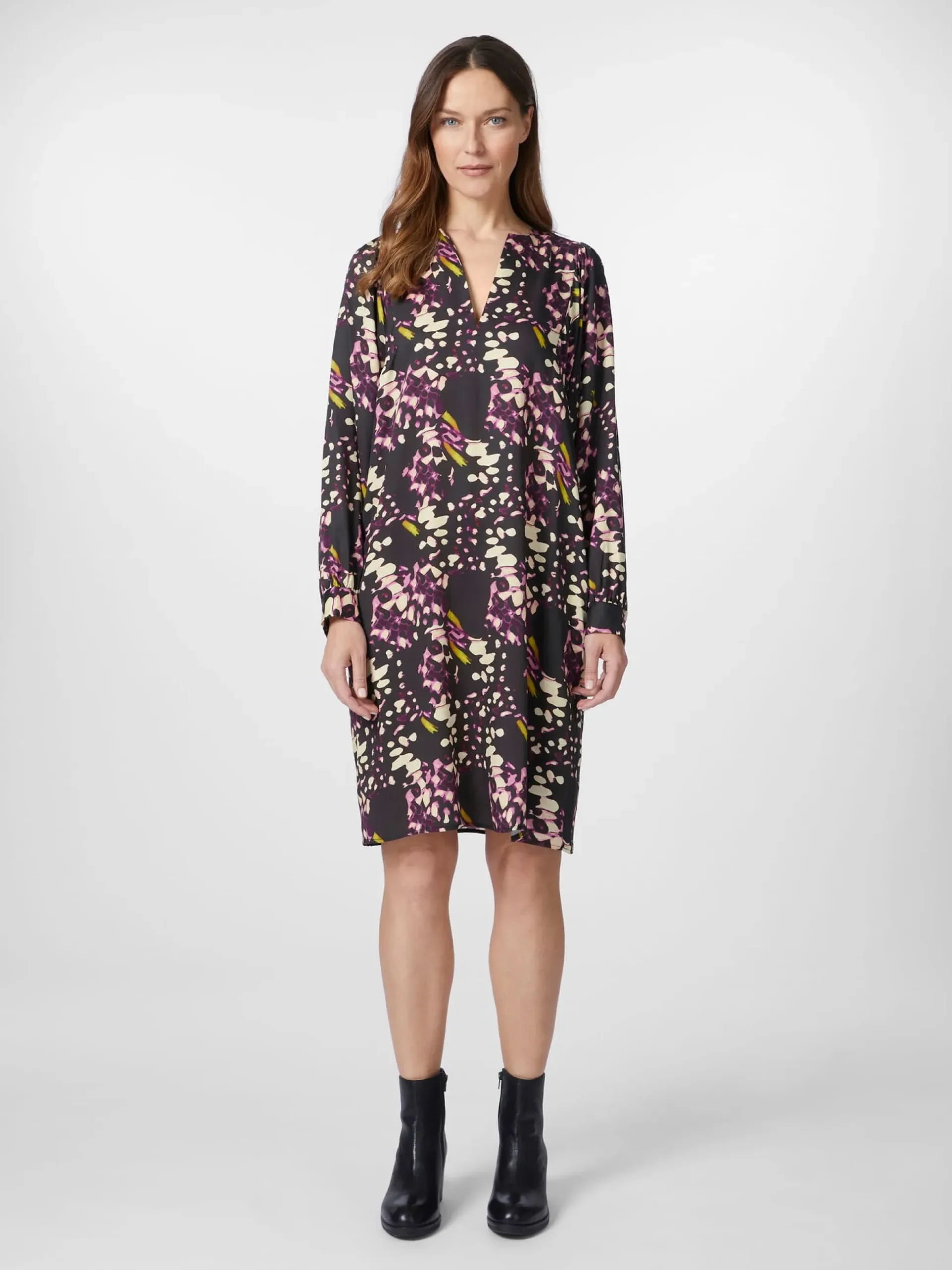 Lanius fertigt dieses etwa knielange Kleid aus reinem Lyocell (TENCEL™), einer regenerativen Zellullosefaser, die aus Holz gewonnen wird, das aus zertifizierten und kontrollierten Quellen stammt und sich durch eine glatte, seidig-weiche Oberfläche auszeichnet. So ist der Stoff besonders tragefreundlich, hat einen schmiegsamen Griff und einen fließenden Fall. Zu Letzterem trägt auch die lockere Passform bei, die den Körper weich umspielt. Die Ärmel sind an der Schulter und an den geknöpften Manschetten leicht gekräuselt angesetzt, was den femininen Charakter unterstreicht und dem Kleid noch mehr Bewegungsfreiheit verleiht. Der tiefe V-Ausschnitt setzt das Dekolleté gut in Szene und streckt die Silhouette optisch. Und durch sein abstraktes Printmuster erhält das Kleid eine lebendige und dynamische Optik.