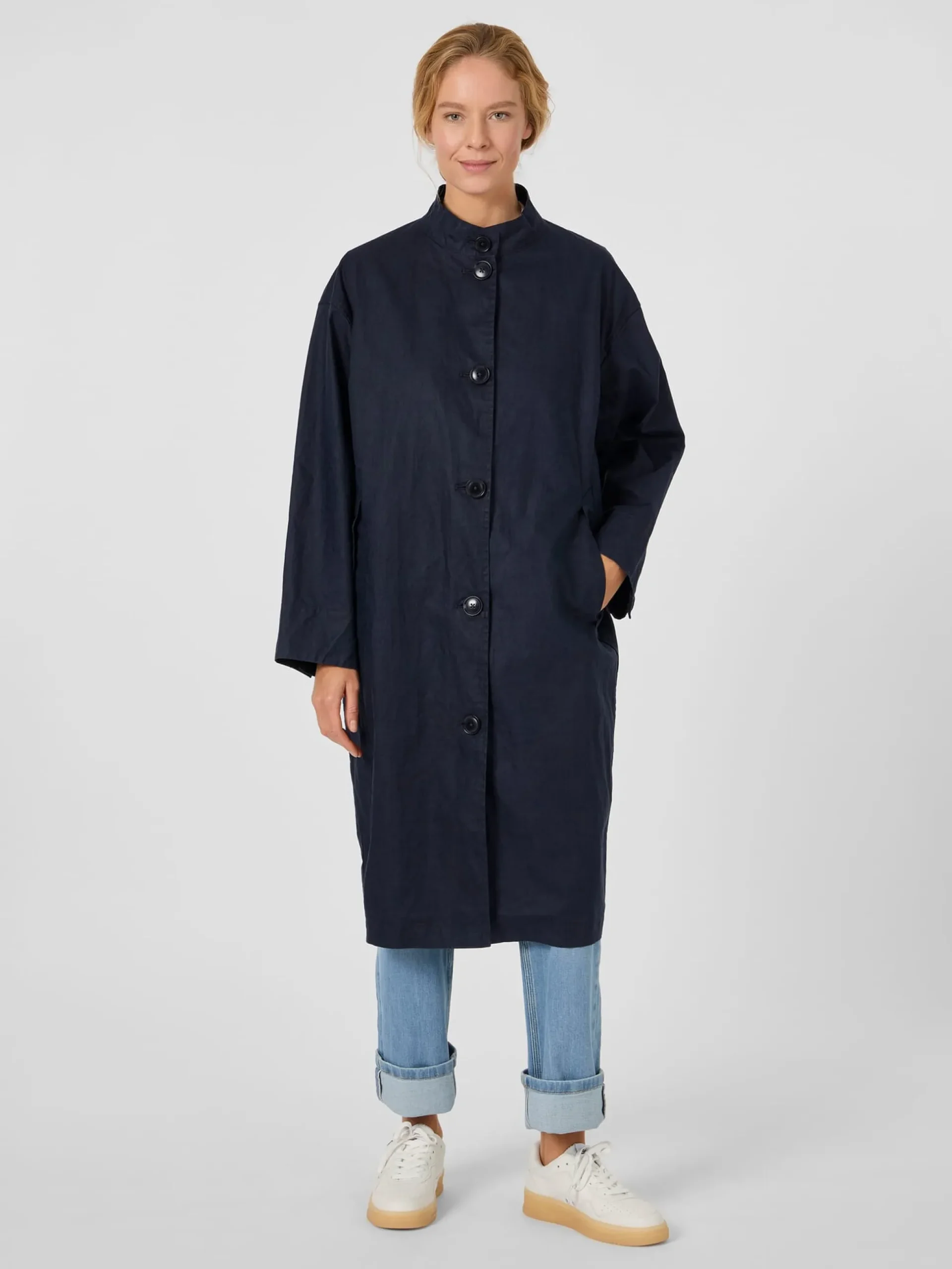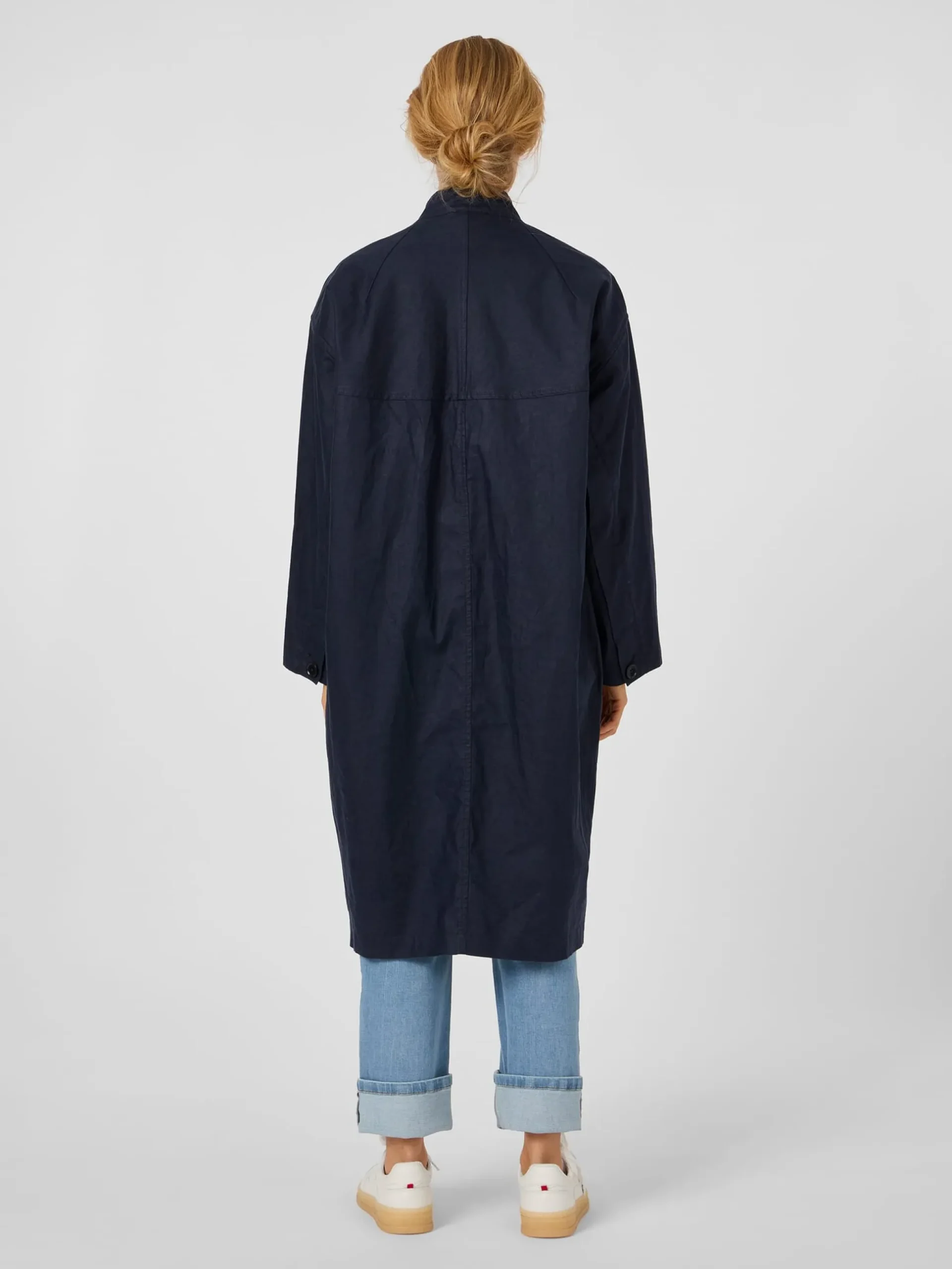 Den Oberstoff dieses bequemen Mantels fertigt LangerChen aus reinem, kontrolliert biologisch angebautem Leinen. Das hautsympathische Gewebe ist leicht und atmungsaktiv und zeigt die materialtypischen Fadenverdickungen. Noch dazu ist es dank der PFC-freien Polyurethan-Beschichtung auf der Innenseite winddicht und wasserabweisend. So ist der Mantel ein idealer Begleiter für die Übergangszeit, der mit seiner legeren Passform mit überschnittenen Schultern viel Bewegungsfreiheit bietet. Lüftungsösen unter den Achseln erhöhen den Tragekomfort noch. Ausgestattet ist der ungefütterte Mantel mit Stehkragen, durchgehender Knopfleiste und knöpfbaren Ärmelabschlüssen. Eine Längsteilungsnaht im Rücken verschlankt die Silhouette optisch. Zwei schräg eingesetzte Schubtaschen und eine Innentasche mit Reißverschluss nehmen Kleinteile des täglichen Bedarfs auf.