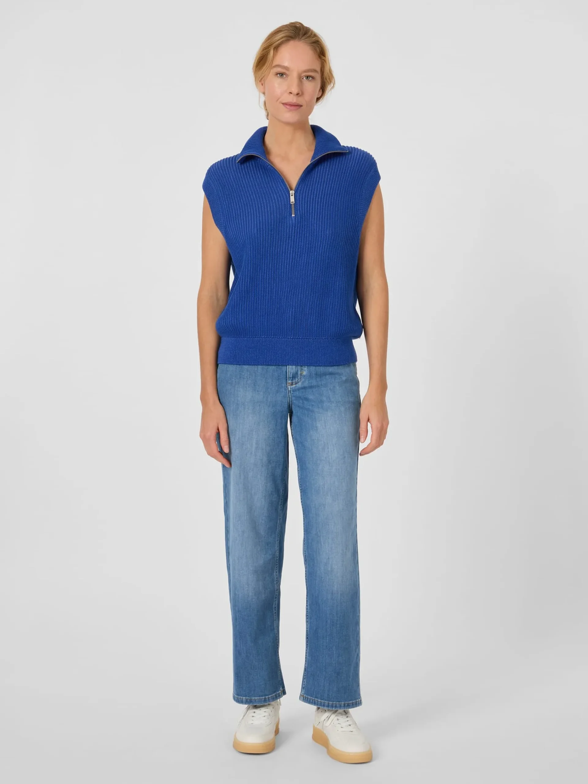 Dieser Pullunder im Troyer-Stil ist verleiht Ihrem Outfit einen maritimen Look. Er ist in luftigem Patenstrick aus hautsympathischer, kontrolliert biologisch angebauter Baumwolle gefertigt, so sorgt er für ein rundum gutes Tragegefühl. Gearbeitet ist der Pullunder mit klassischem Troyerkragen und einem bis zur Brust reichenden Metallreißverschluss. Feine Rippenstrickbündchen bilden den Abschluss an Armausschnitten und Rumpf.