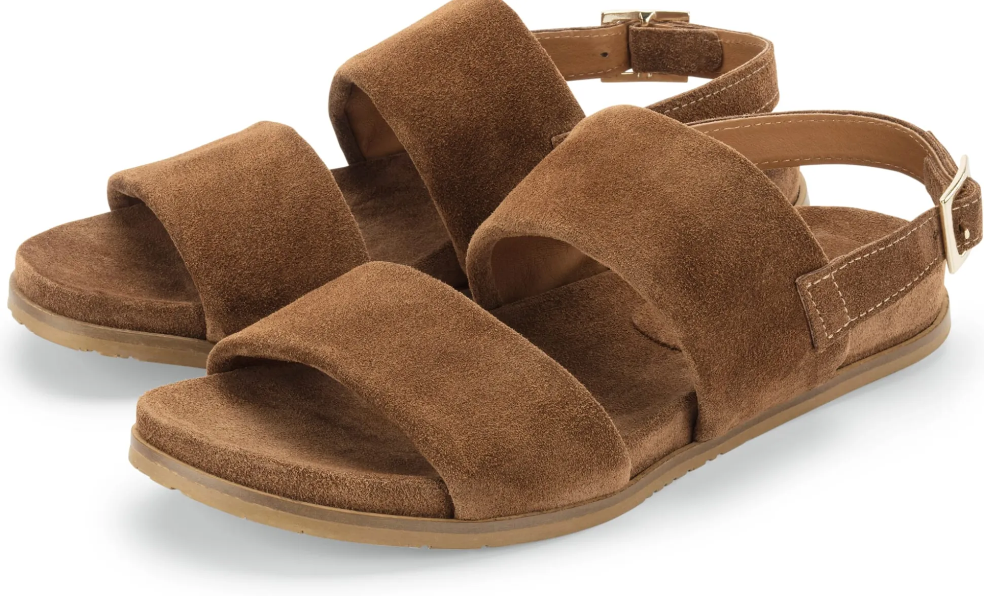 Dieses formschöne Modell zeigt einmal mehr, dass elegante Sandalen auch ungemein tragefreundlich sein können. Das Obermaterial besteht aus samtigem Kalbveloursleder. Innen sorgen das Futter aus weichem Schweinsleder und die Decksohle aus Kalbveloursleder für ein geschmeidiges Tragegefühl und ein ausgeglichenes Fußklima. Die über Vorderfuß und Spann laufenden Riemen, der verstellbare Fersenriemen und das anatomisch geformte Fußbett geben dem Fuß Halt und ermöglichen bequemes Gehen und Stehen selbst über viele Stunden. Die rutschfeste Gummisohle bietet guten Grip auf vielen Untergründen.