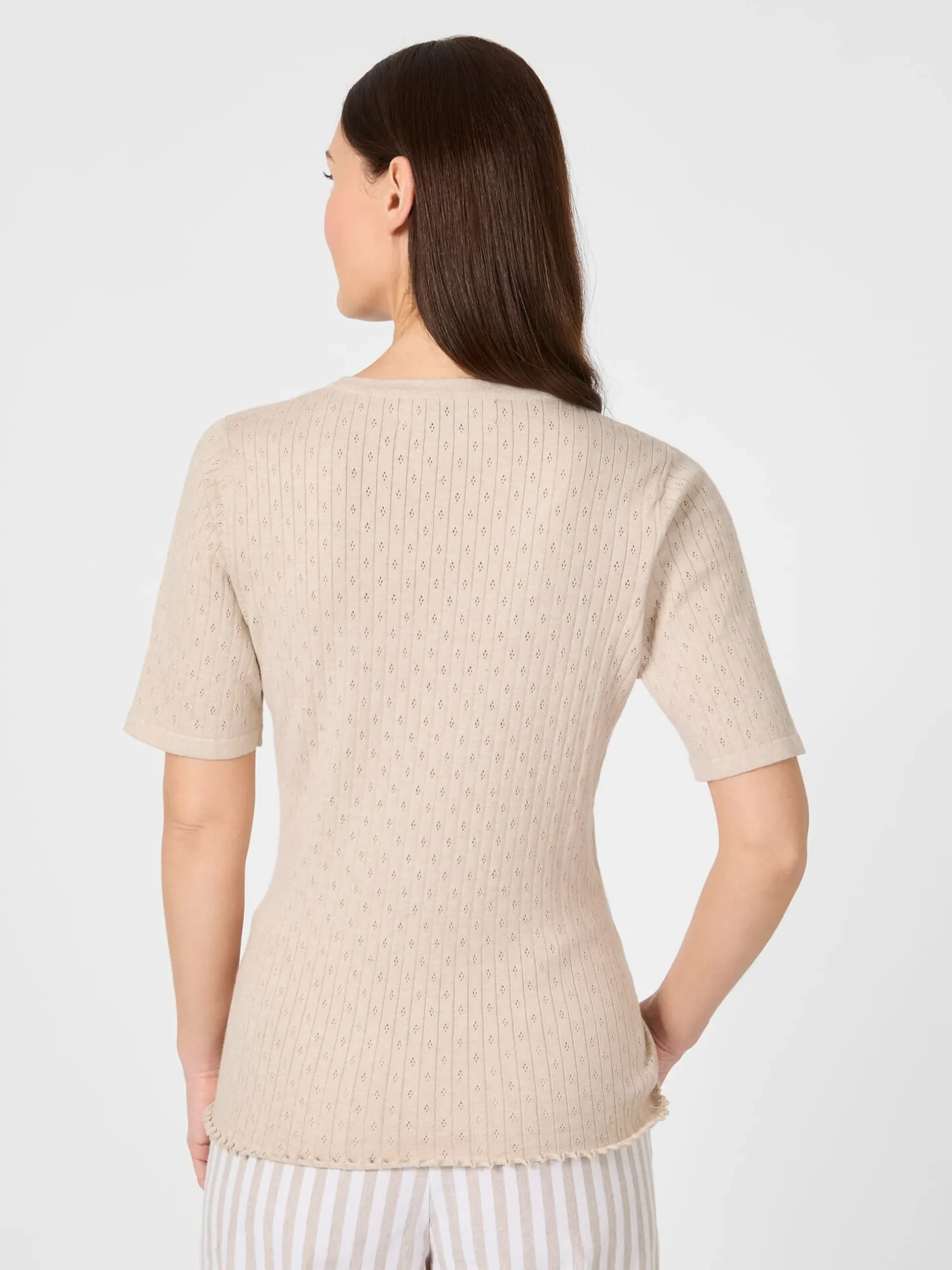 Dieses feminine Strickshirt fertigt Care By Me aus einer seltenen Materialkombination von Baumwolle, Seide und Kaschmir. Sie macht das Gestrick hautfreundlich, schmiegsam und strapazierbar, verleiht ihm aber auch wärmende und temperaturausgleichende Eigenschaften. Die feine Rippenstruktur und das schöne Ajourmuster sorgen für eine markante Optik. Gearbeitet ist das Shirt mit elastischen Rippenstrickbündchen an Hals und Ärmeln. Ein schönes Detail ist der wellenförmig verlaufende Rollsaum am Rumpf.