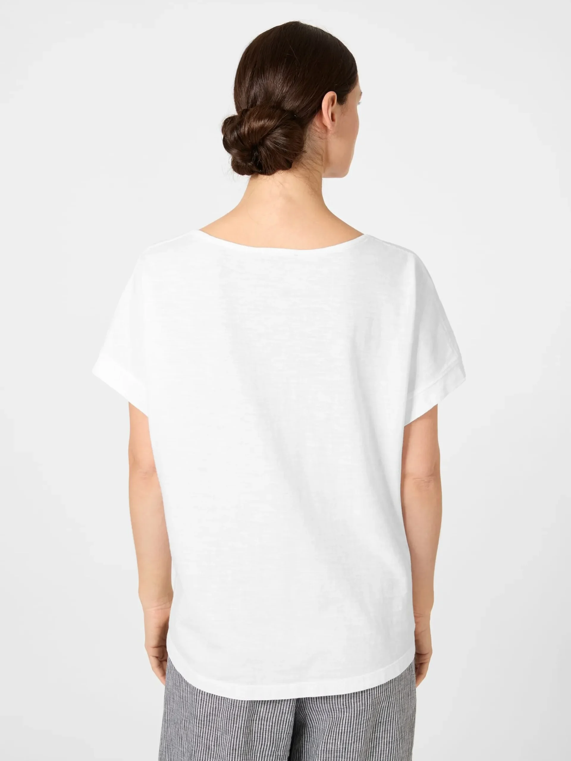 Für den fließend fallenden Single-Jersey dieses Shirts wird ein Flammgarn aus kontrolliert biologisch angebauter Baumwolle verwendet. Bei diesem Effektgarn werden zwei unterschiedlich dicke Garne zusammengezwirnt, von denen eines das andere umwickelt. Das bewirkt eine leicht unregelmäßige Struktur, die den Stoff sehr lebendig wirken lassen. Gearbeitet ist das leicht transparente Shirt in lockerer Passform, mit weitem Ausschnitt und gerundetem Saum. Ein schönes Basisstück – leicht und luftig, perfekt für den Sommer.