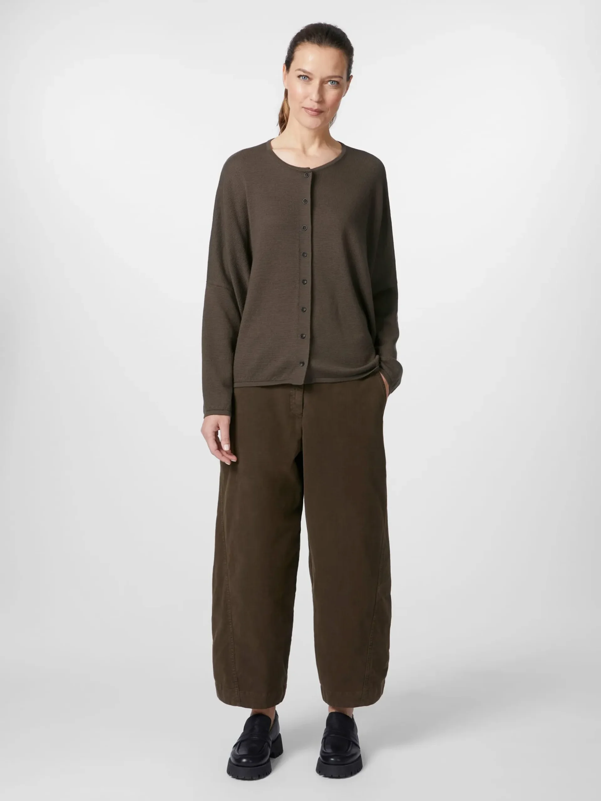 Schnörkellos und puristisch kommt diese Strickjacke daher. Ihr feines Gestrick aus reiner, wärmender Schurwolle zeigt eine filigrane Waffelstruktur, dank der Oska-typisch stark überschnittenen Form sitzt die Jacke lässig und bequem.
