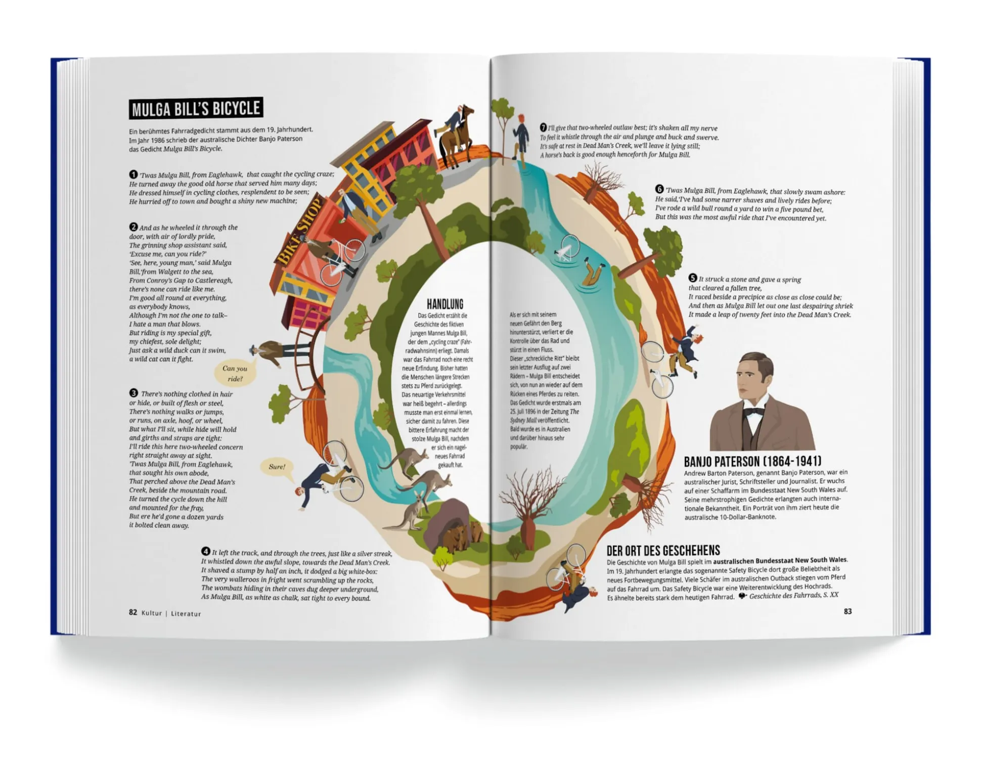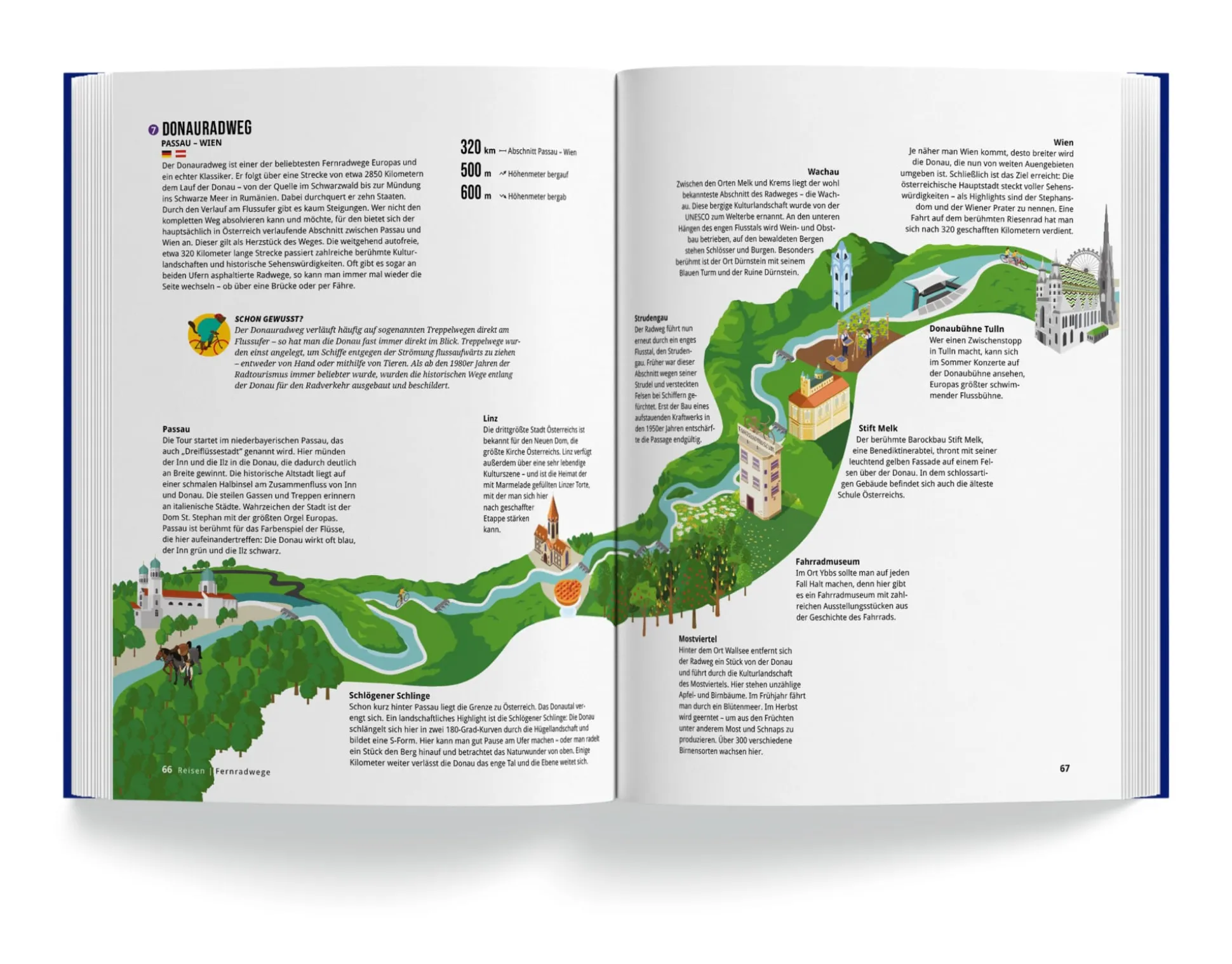 Das Fahrrad ist über 200 Jahre alt – und heute wichtiger denn je. Es ist Begleiter in allen Lebenslagen, mechanisches Wunderwerk, Sportgerät und Freiheitsmaschine. Und ein Schlüssel für lebenswerte Städte der Zukunft. Das Fahrradbuch vermittelt in über 1000 Grafiken, Karten und Illustrationen umfassendes Wissen über das Fahrrad. Es erzählt von der Laufmaschine, dem ultraleichten Carbon-Rennrad oder dem E-Lastenrad. Vom Glücksgefühl auf zwei Rädern und dem gefürchteten Hungerast. Von den schönsten Radreisen, mythischen Bergen des Radsports und Legenden der Tour de France. Von autofreier Mobilität, wachsender Fahrradkultur – und den schönsten Songs und Filmen übers Radfahren. Ein Buch zum Stöbern und Entdecken für alle, die ihr Fahrrad lieben.