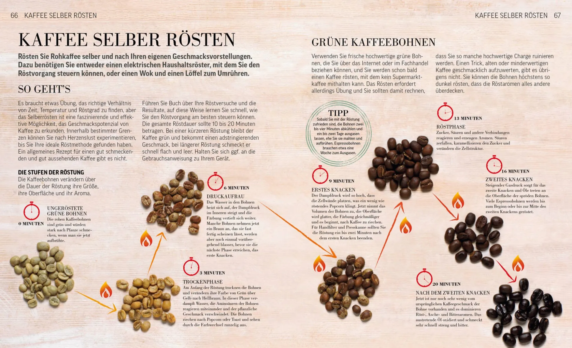 Von A bis Z, vom Anbau der Pflanze bis zu den Varianten der Zubereitung des belebenden Getränks, widmet sich dieser Band aus dem Verlag Dorling Kindersley dem Kaffee. Ausführliche Karten, Infografiken und Erläuterungen handeln von den Kaffeeanbaugebieten der Welt und versammeln alles Wissenswerte zur Geschichte des Anbaus, zu den verschiedenen Bohnensorten sowie zu Ernte, Lagerung und Verarbeitung. Im zweiten Teil, der mit dem Titel „Kaffeekunde“ überschrieben ist, steht die Kaffeebohne selbst im Mittelpunkt. Da geht es zum einen um Auswahl und Röstung der begehrten Samen und zum anderen ums geschmackschonende Mahlen. Zu guter Letzt spielt dann bei der Zubereitung der verschiedenen Kaffeespezialitäten auch die Milchschaumkunst, in der begabte und geübte Baristas regelmäßig Meisterschaftswettkämpfe abhalten, eine Rolle. Rezepte für warme und kalte Köstlichkeiten mit Kaffee runden die Kaffee-Sammlung ab.