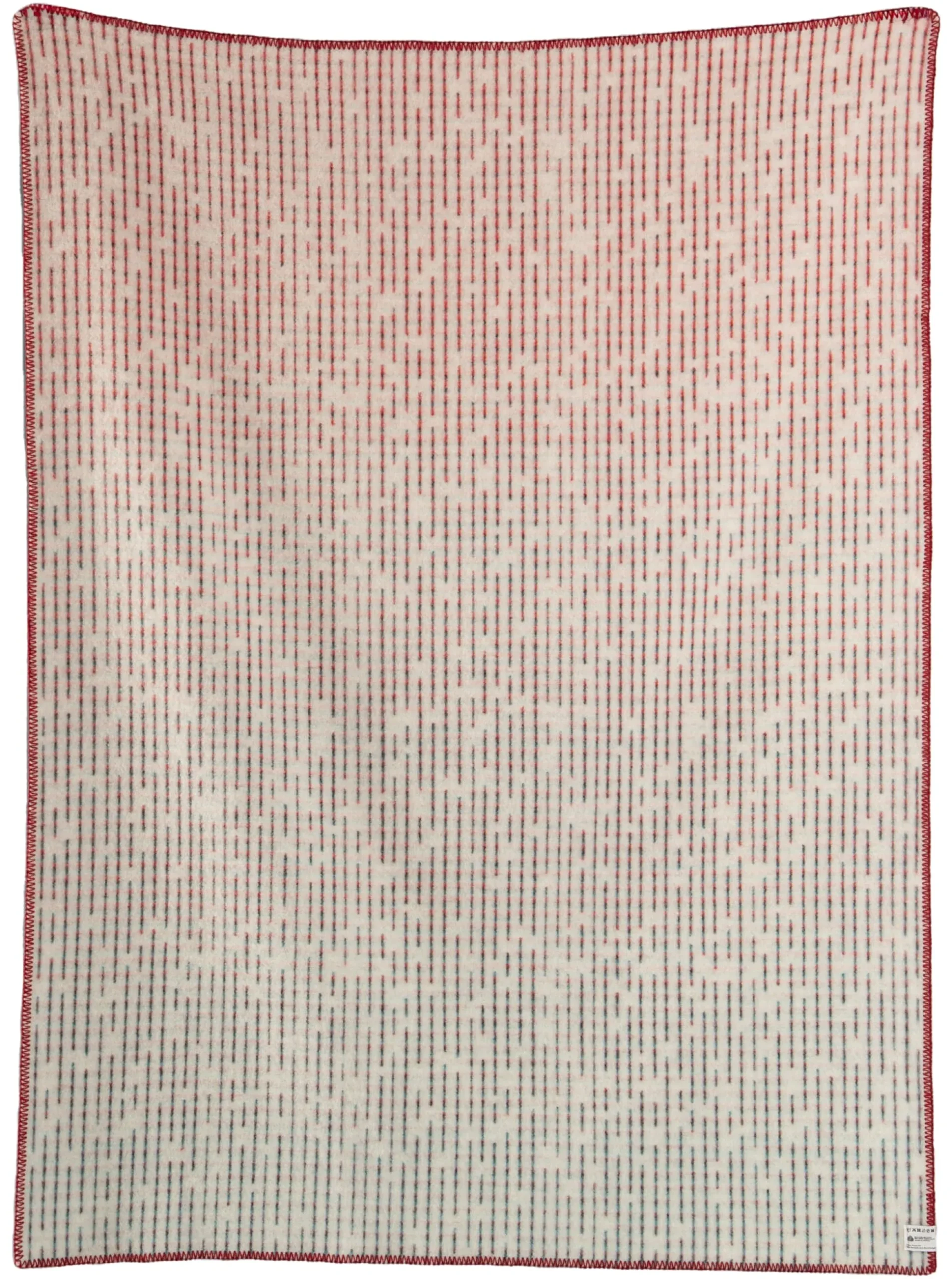 Voluminöse, griffige und weiche Decke aus norwegischer Lammwolle im Design von Inga Sempé, das das norwegische Textilunternehmen Røros Tweed exklusiv für MAGAZIN neu aufgelegt hat. Die unterschiedlichen Rhythmen der changierenden horizontalen und fast wie Regen wirkenden vertikalen Linien treffen wie zufällig aufeinander und lassen Decke und Muster lebendig und immer wieder unterschiedlich wirken. Schön: Das Muster erscheint auf der Rückseite invers. Die Kettelnaht stabilisiert die Ränder und greift den Grundton der Decke auf.