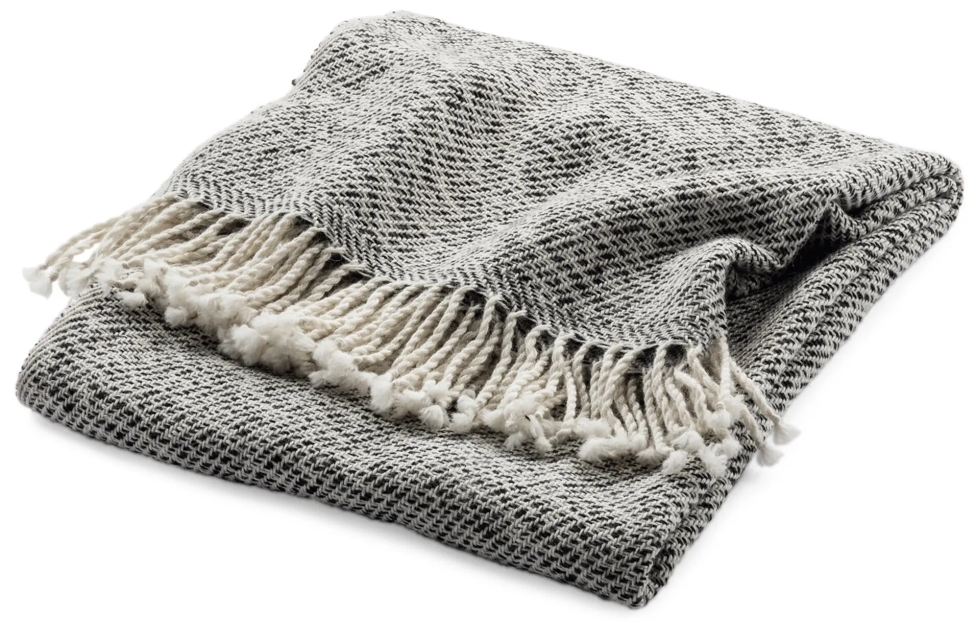 Aus weichem, leichtem Babyalpaka ist diese Decke gewebt. Babyalpaka stammt häufig von den Jungtieren aus der ersten Schur, aber auch das Haar der adulten Tiere wird Babyalpaka genannt, wenn die Faserfeinheit zwischen 19 und 21,9 Mikrometern liegt, es also äußerst fein ist. Im Schuss werden hier zwei Fäden, einer in Schwarz, der andere in Weiß, eingesetzt, die sich beim Weben leicht verdrillen und so der Decke die lebendige Oberfläche verleihen.