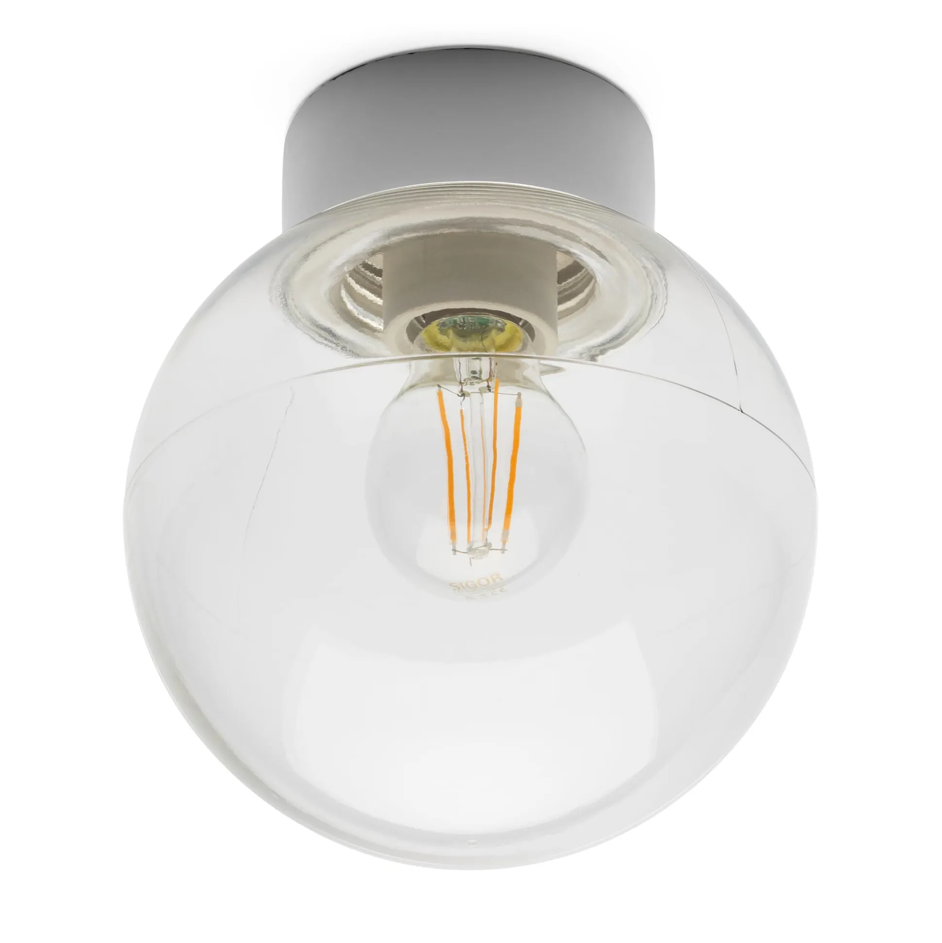 Weißer Porzellansockel, Ø 10 cm. Kuppel aus mundgeblasenem Klarglas, Ø 18 cm. Kunststoffdichtung. Höhe 20,5 cm. Gewicht 1,1 kg. Keramikfassung E27 (max. 75 W). Lieferung ohne Leuchtmittel.
