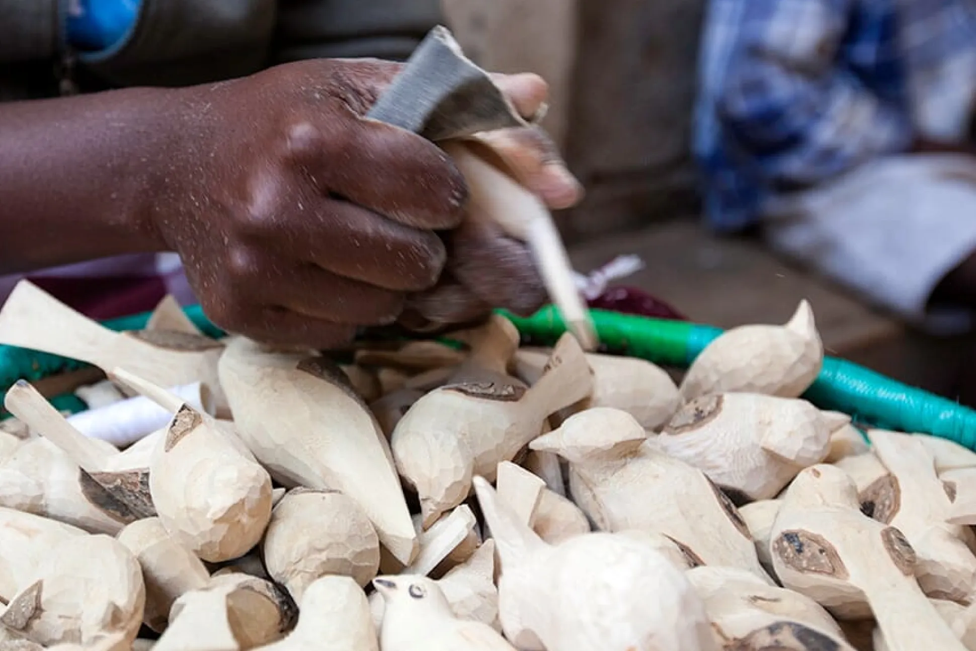 Auch für diese „bunten Vögel“ wird ein regional verfügbarer Werkstoff verwendet: das Holz des Jacarandabaumes (Jacaranda mimosifolia). Damit die Bäume unbeschadet weiterleben, wachsen und gedeihen können, werden ausschließlich heruntergefallene oder bereits angebrochene Äste und Zweige gesammelt, um die Vögel daraus zu arbeiten. Von Hand geschnitzt, glatt geschliffen und bemalt, entstehen dabei einzigartige kleine Objekte: naturnah, zugleich mit einem Quäntchen künstlerischer Freiheit gestaltete Gesellen, die Ihre dekorativen Arrangements mit farbenfrohen Tupfern bereichern – im Weihnachtsbaum ebenso wie als Schlüsselanhänger, am Türkranz ebenso wie als Geschenkverzierung.