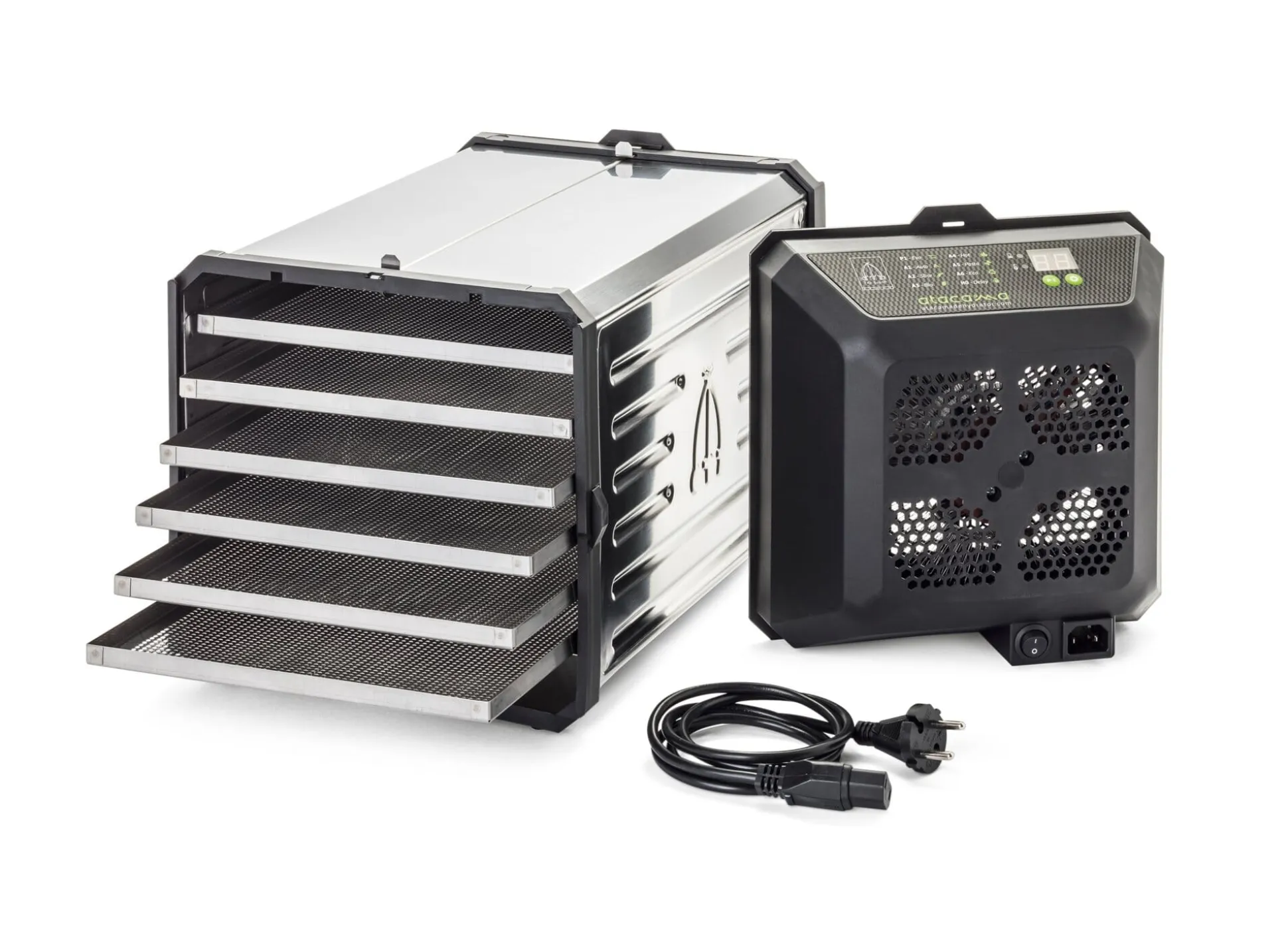 Dieses ist das Nachfolgemodell unseres italienischen Dörrgerätes von Tre Spade in Mailand. Im Vergleich zum Vorgänger hat eine Sache sich geändert: Der Motorblock ist jetzt nach außen gelegt und lässt das Gerät ein wenig raumgreifender erscheinen. Seine Vielseitigkeit ist ihm aber geblieben: Im Rohkostmodus kann bei 40 °C wirklich schonend getrocknet werden. Obst, Gemüse, Kräuter, Samen und Pilze lassen sich so in hoher Qualität konservieren (auch für die hauseigenen Instantbrühen), Fruchtleder und Getreideprodukte herstellen oder hausgemachte Pasta, Baiser und Backwerk trocknen.