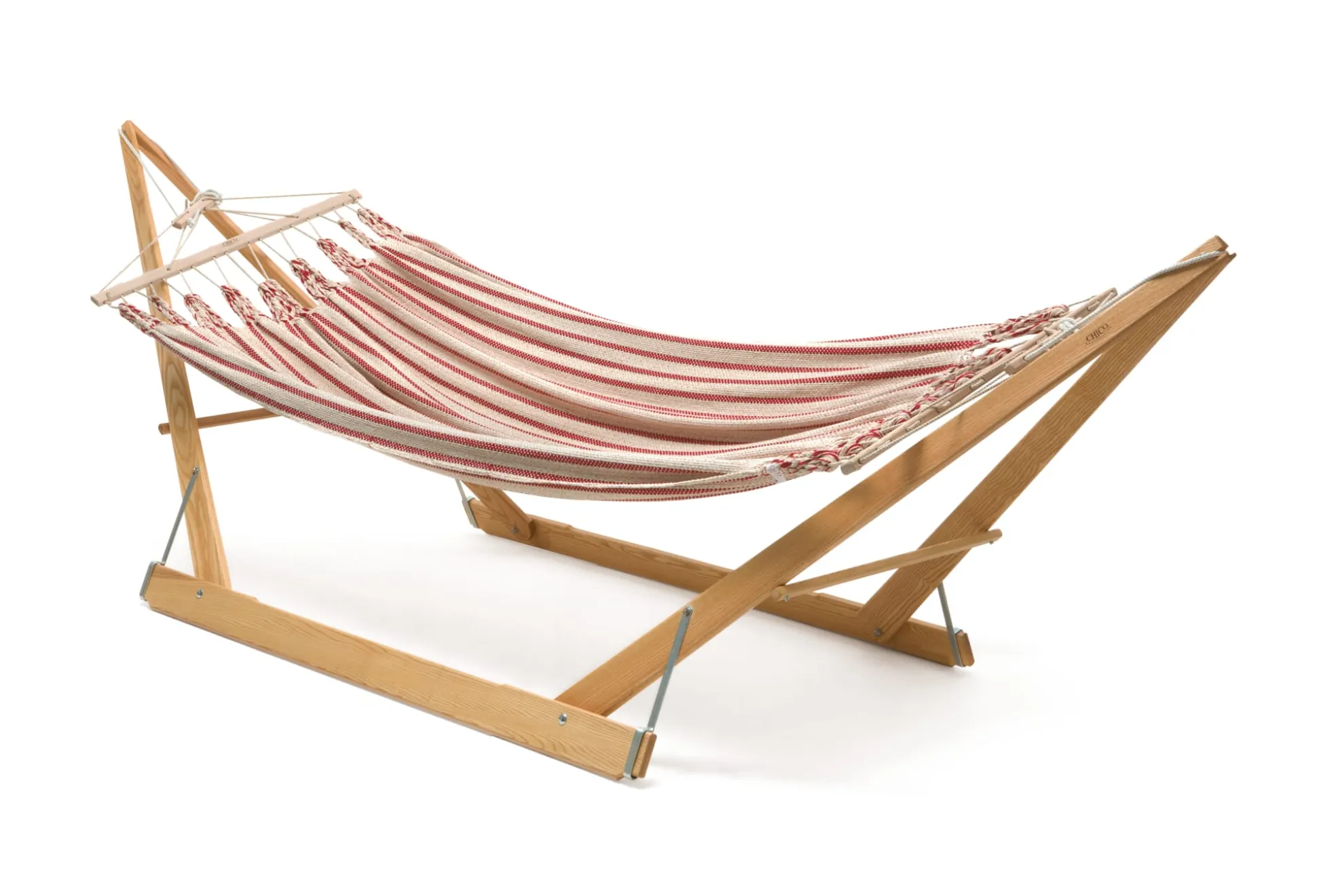Die Hängematten werden in einer eigens entwickelten Endloswebtechnik gearbeitet, sie sind nicht nur von einer Materialopulenz, die man schon beim ersten Griff spürt – sie sind vor allem auch außerordentlich reißfest. Ein verstellbarer hölzerner Fixierstab verhindert das Zusammenrutschen der Matte, eine Spannvorrichtung ermöglicht Längenänderungen. Einzig beim Tragseil verwendet der Hersteller ein synthetisches Material, eine UV- und witterungsbeständige Polyestermischung, die die langfristige Belastbarkeit der Hängematte gewährleistet.