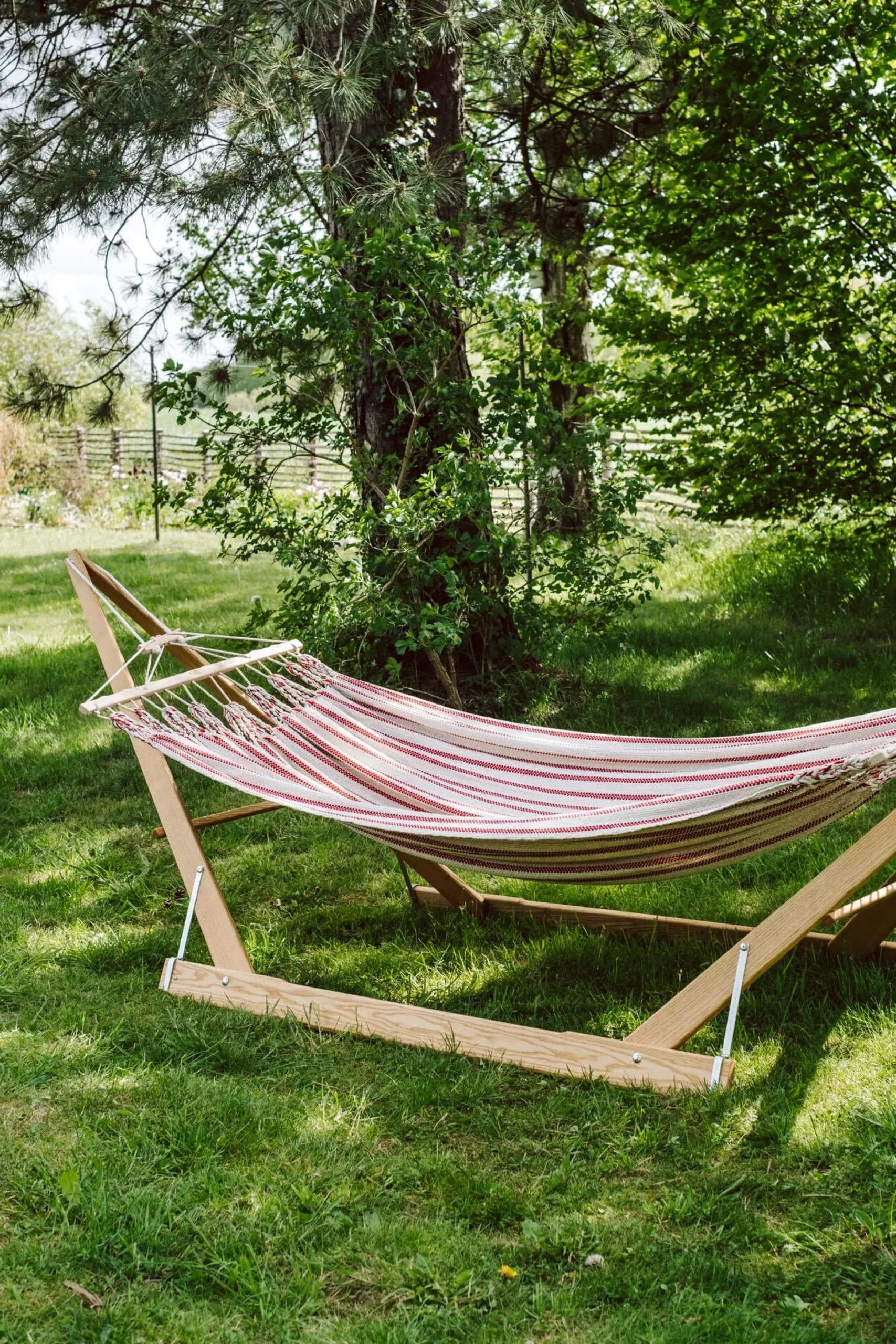 Für zwei Personen, zum Querliegen oder zum Sitzen und bequemen Schaukeln. 100% Baumwolle, Eschenholz, Tragseil Polyester. Spannweite mindestens 3,50 m, 210 × 190 cm. Gewicht 6,3 kg. Belastungsgewicht max. 250 kg. Hergestellt in Österreich. Lieferung ohne Ständer.