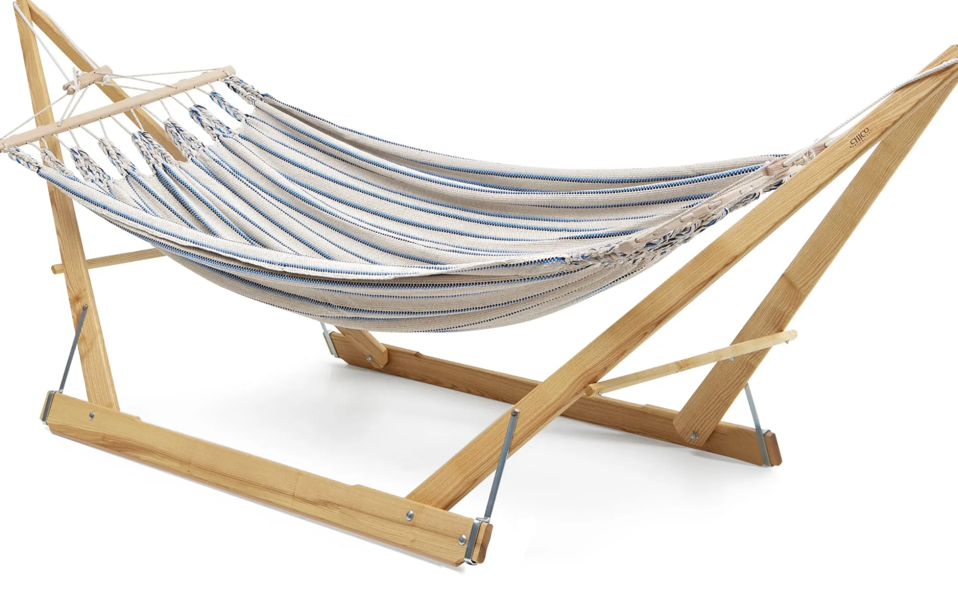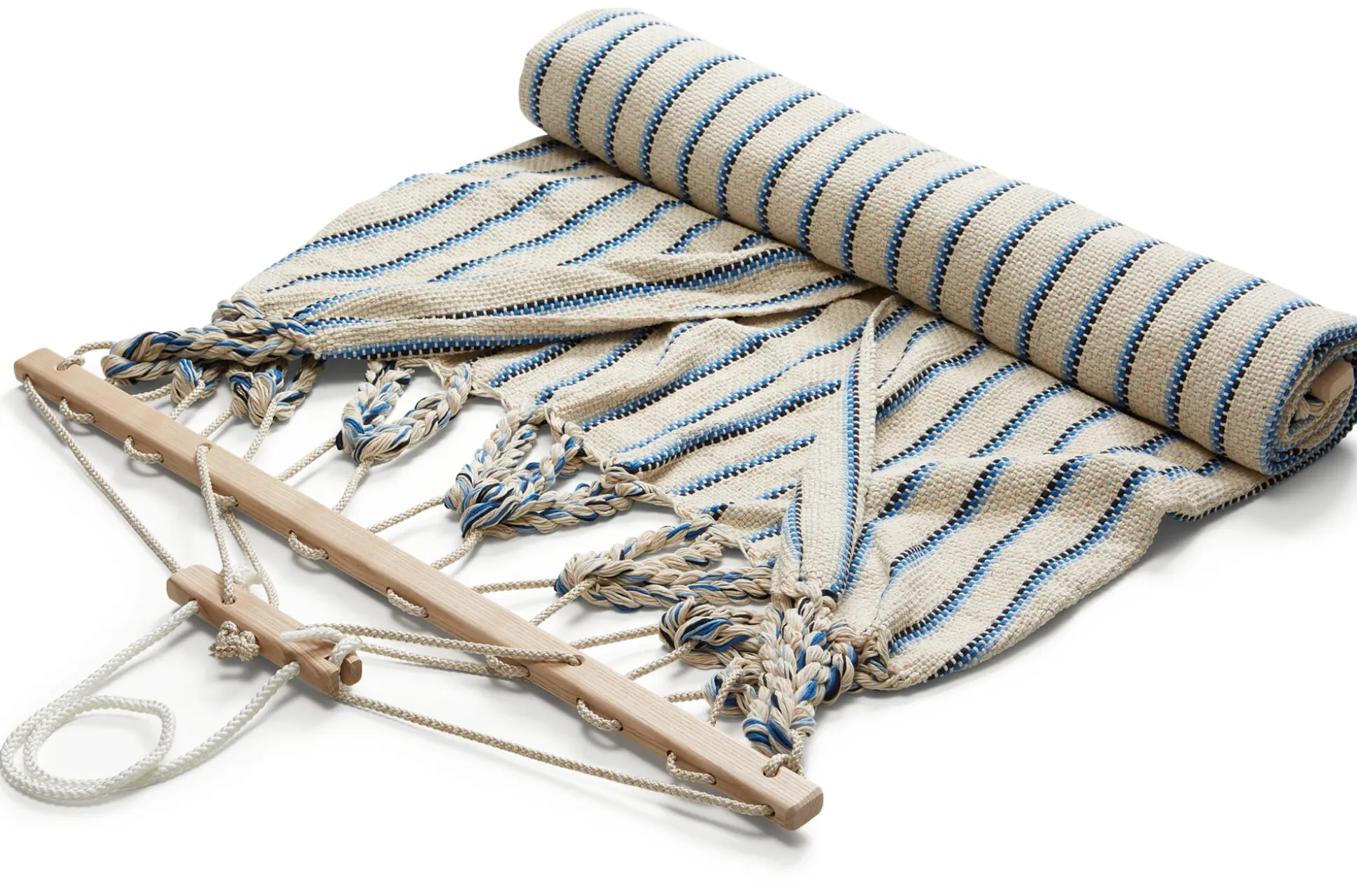 Die Hängematten werden in einer eigens entwickelten Endloswebtechnik gearbeitet, sie sind nicht nur von einer Materialopulenz, die man schon beim ersten Griff spürt – sie sind vor allem auch außerordentlich reißfest. Ein verstellbarer hölzerner Fixierstab verhindert das Zusammenrutschen der Matte, eine Spannvorrichtung ermöglicht Längenänderungen. Einzig beim Tragseil verwendet der Hersteller ein synthetisches Material, eine UV- und witterungsbeständige Polyestermischung, die die langfristige Belastbarkeit der Hängematte gewährleistet.