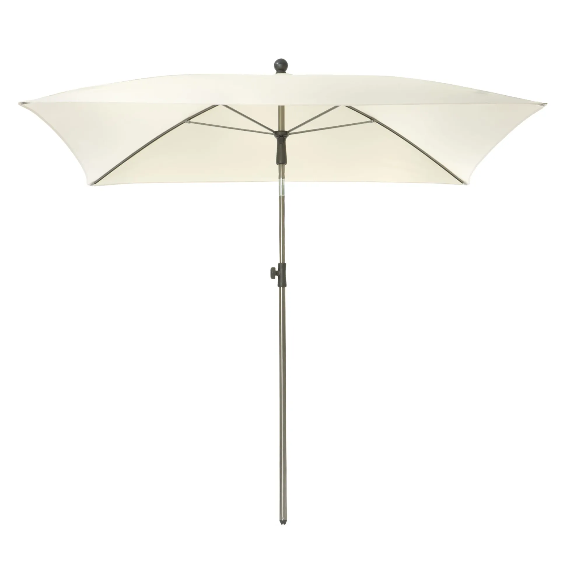 Edelstahlmast (Oberrohr Ø 2,7 cm, Unterrohr Ø 3 cm). Pulverbeschichtete Paragonschienen. Drehknauf Polyamid. Bespannung 100% Polyester (Flächengewicht 180 g/qm). Hergestellt in Österreich. Quadratisch, ca. 1,8 × 1,8 m. Stufenlos höhenverstellbar von 1,8–2,4 m. Neigungswinkel bis 35°. Gewicht 2,8 kg. Ohne Schirmständer.