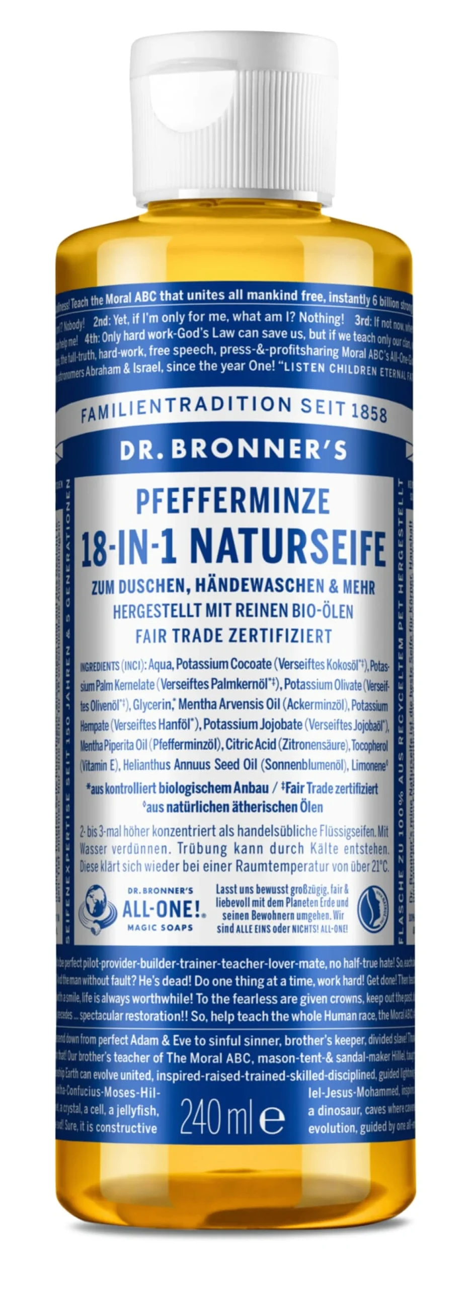Wir können nicht mit Bestimmtheit sagen, was genau Dr. Bronner’s zum Kult in den USA gemacht hat, wohl aber, dass die Qualität der Produkte uns restlos überzeugt hat. In der bis heute familiengeführten Seifenmanufaktur werden sie aus rein pflanzlichen Rohstoffen gefertigt, die größtenteils aus biologischem Anbau stammen und Fair-Trade-zertifiziert sind. Dr. Bronner’s verzichtet weitgehend auf Umverpackungen (weshalb die Schrift auf den Etiketten recht klein ausfällt, damit jeweils viele Botschaften darauf passen).