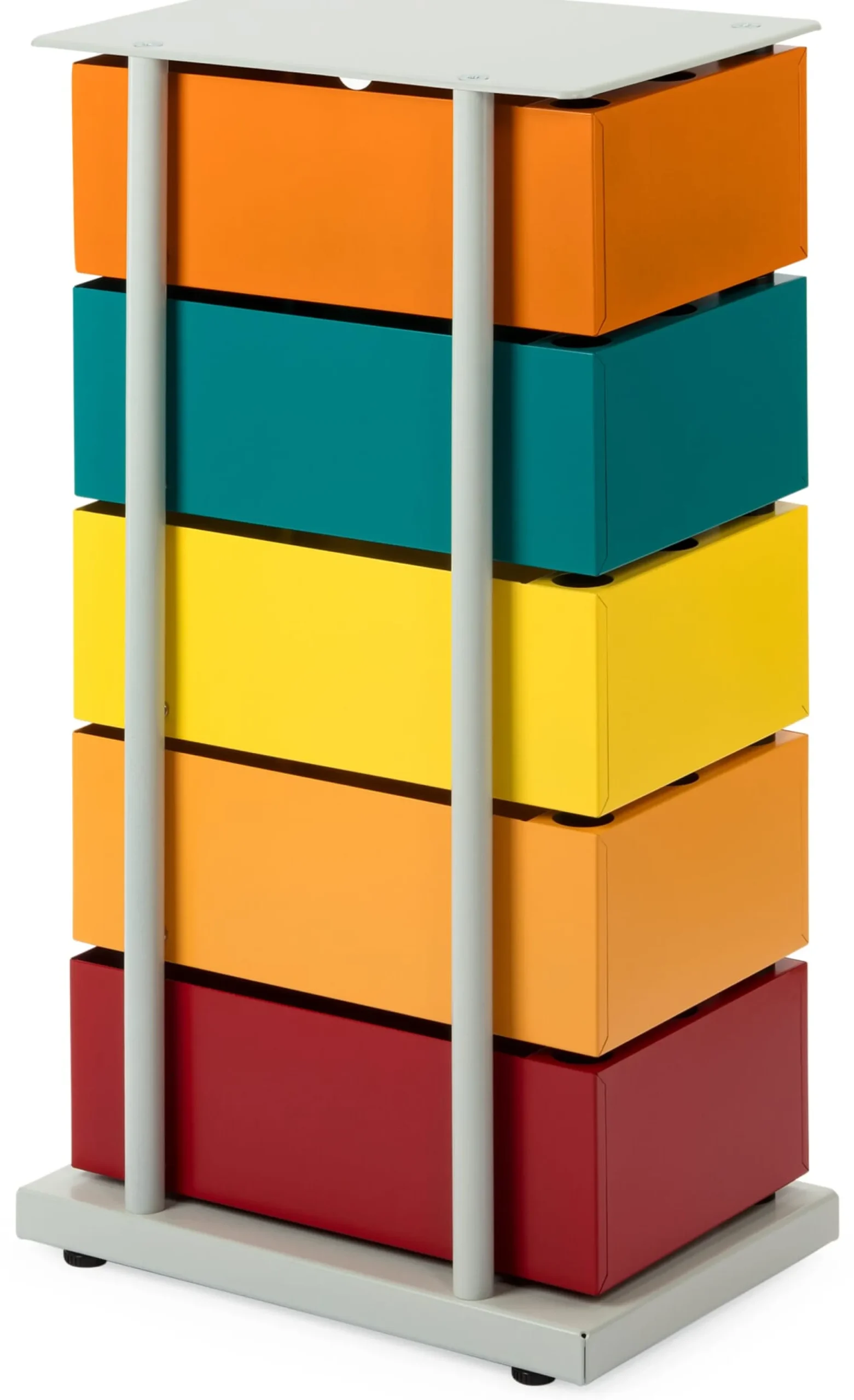 Im englischen Sprachraum „Pivot Cabinet“ genannt – „pivot“ bedeutet so viel wie „Drehgelenk“ oder „Schwenkachse“ –, verweist diese Bezeichnung auf das wesentliche konstruktive Element des Containers: Die einzelnen Laden werden an einer Achse aufgeschwenkt, nicht aufgezogen oder -geklappt, wie üblich. Diese Konstruktionsidee wurde unter anderem durch Joe Colombos 1970 entwickelten Rollcontainer „Boby“ bekannt. Der italienische Architekt war zugleich einer der führenden futuristischen Industriedesigner der 1960er Jahre, einer Zeit der Aufbruchstimmung und Zukunftsvisionen, die – folgt man beispielsweise Herbert Marcuses Gedankengang – den Weg aus dem Reich der Notwendigkeit in das Reich der Freiheit zu bahnen suchten. Entwürfe wie Verner Pantons Freischwinger „Panton Chair“, Olivier Mourgues Sessel „Djinn“, der in „2001 – Odyssee im Weltraum“ das Interieur der Raumstation schmückte, und Colombos „Tube Chair“ wurden zu Ikonen. Colombos „dynamische Möbelstücke“ zielten dabei stets auch auf Multifunktionalität ab.
